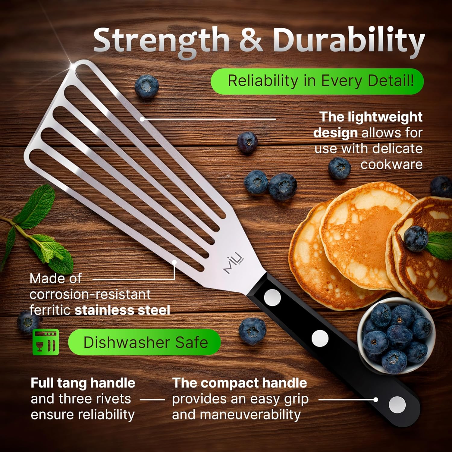 - Multi-Functional – suitable for most applications that require a spatula: flipping pancakes, grilling burgers, cooking scrambled eggs or omelette and removing items from a roasting pan
