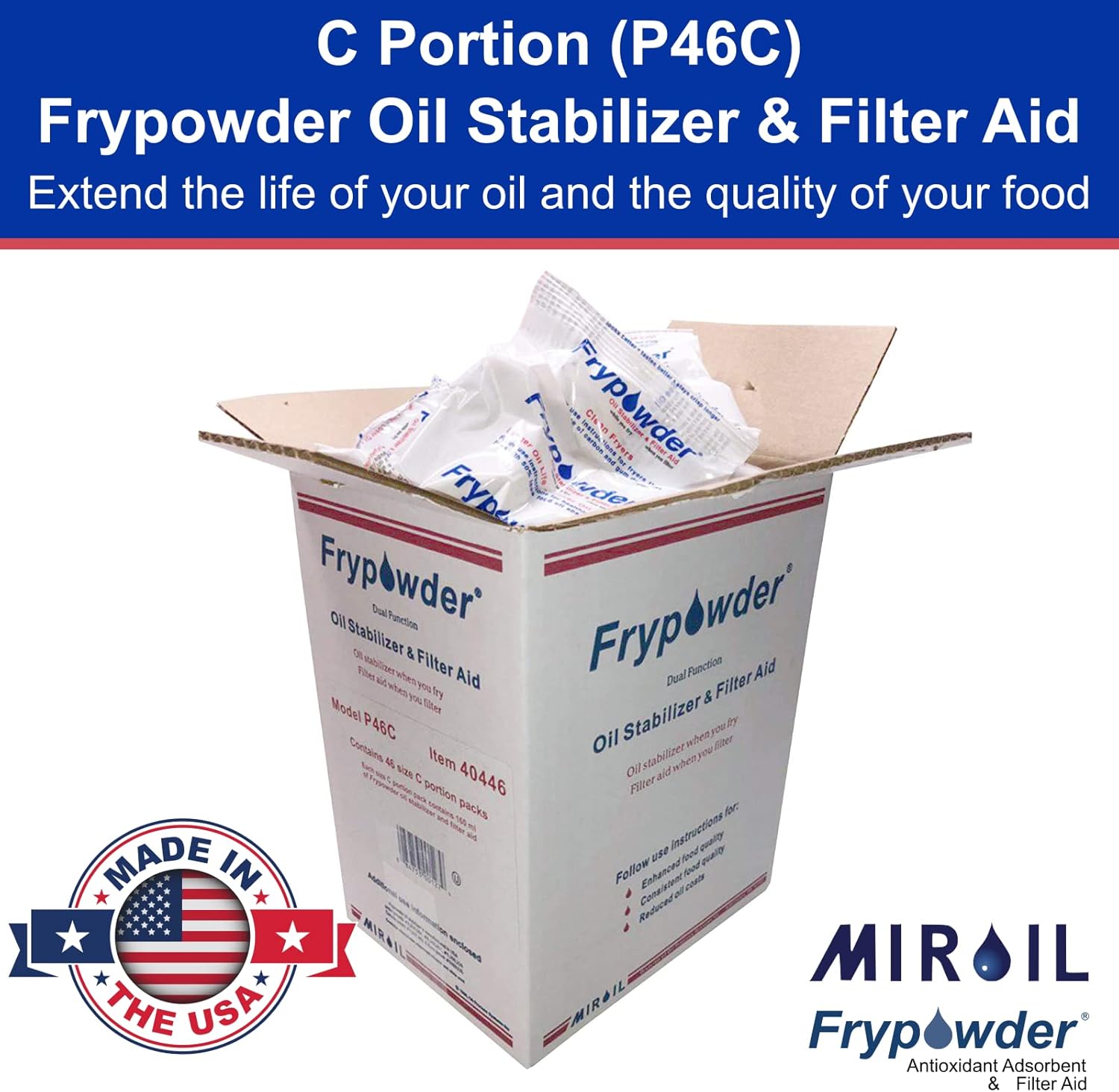 - MULTIPLE MIROIL FRYPOWDER BUYING OPTIONS FOR MAXIMUM CONVENIENCE & SAVINGS – Choose the perfect solution for your fryer maintenance with MirOil FryPowder available in bulk bags or pre-measured portion packets. BULK OPTIONS: L103 (3-gallon bag for 46 B-size or 70 C-size portions) and L104 (4-gallon bag for 62 B-size or 93 C-size portions). PORTION PACKETS: P100 (90 C-size portions, 160ml each), P46C (46 C-size portions, 160ml each), and P36B (72 B-size portions, 240ml each).