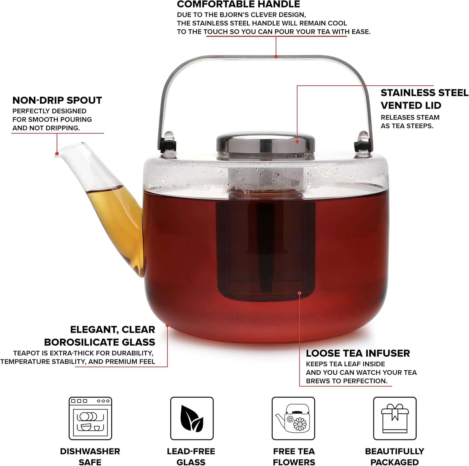 - Viva Bjorn Tea Pot: Made of durable and elegant borosilicate glass, this teapot is the perfect solution for brewing loose leaf tea or tea bags. Includes reusable stainless steel mesh infuser basket.