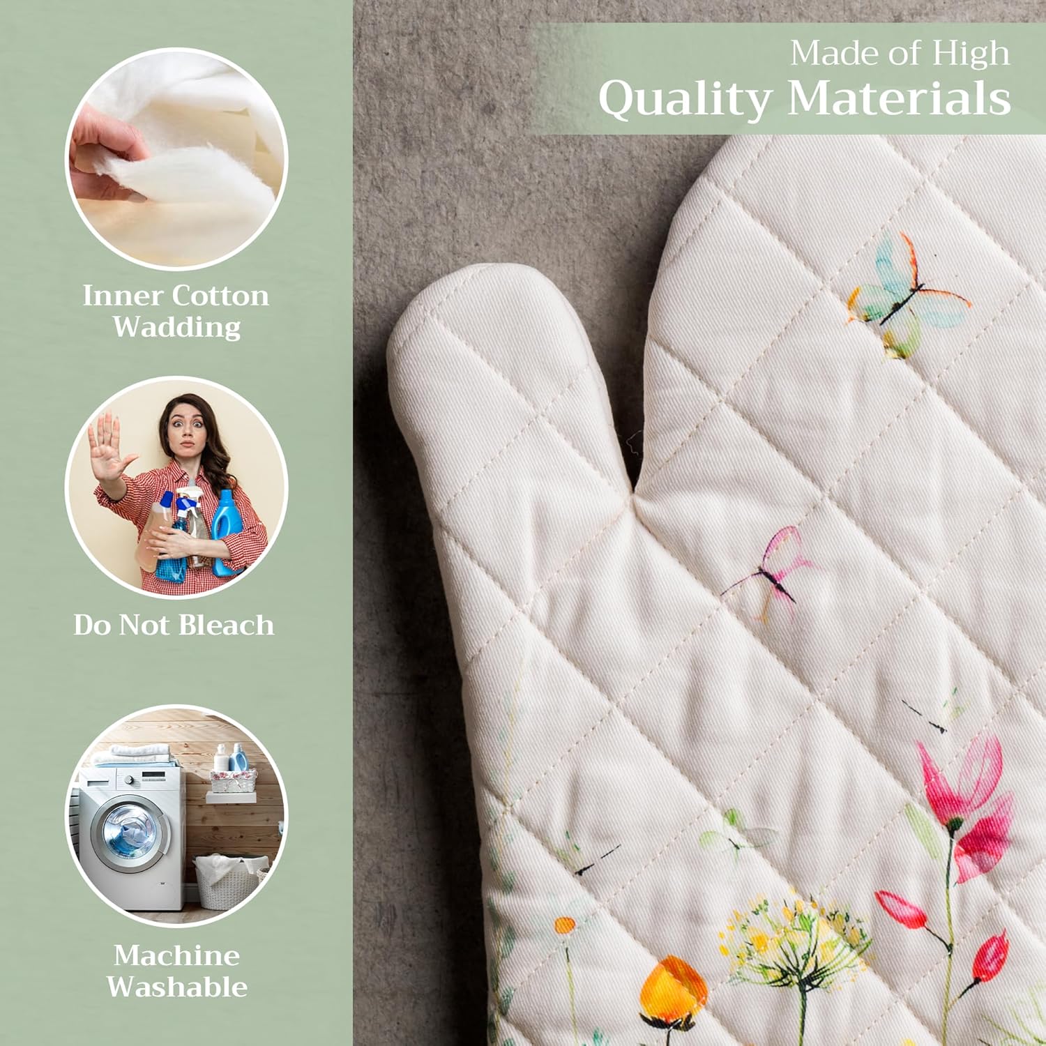 - 100% Quilted cotton: Crafted from thick, durable quilted cotton, this heat resistant oven mitt provides a soft feel, safe handling, and lasting performance. A must-have kitchen accessory for everyday cooking, roasting, or baking tasks