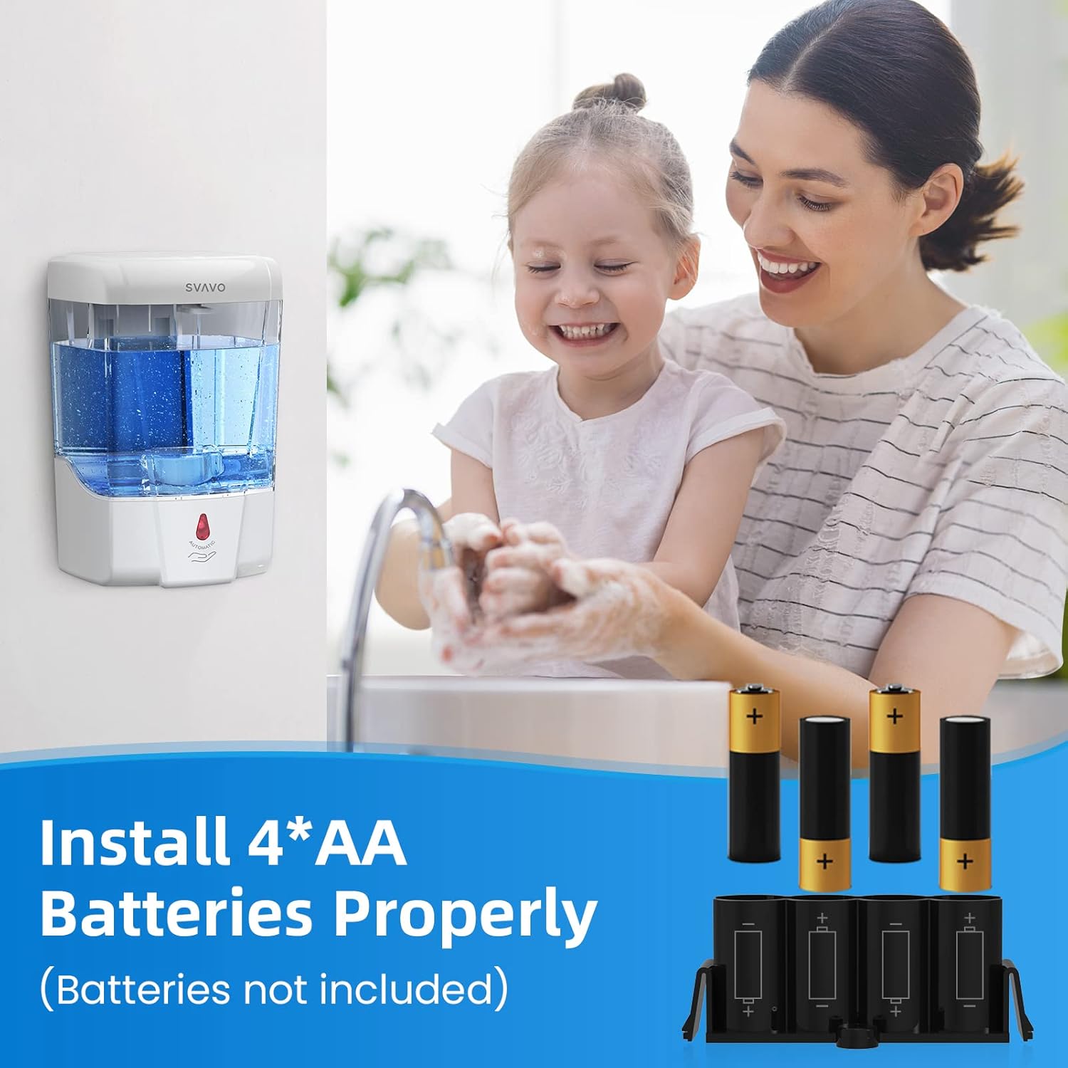 - ✔️ [Space Saving & Energy Efficiency] The wall-mounted soap dispenser features save space on a confined vanity; The mount design allows you to save countertop space naturally-Small Footprint and Large Capacity. 4 AA-size batteries (not included) will allow you to enjoy hands-free soap dispensing for up to a year before having to change batteries, not over consume battery.