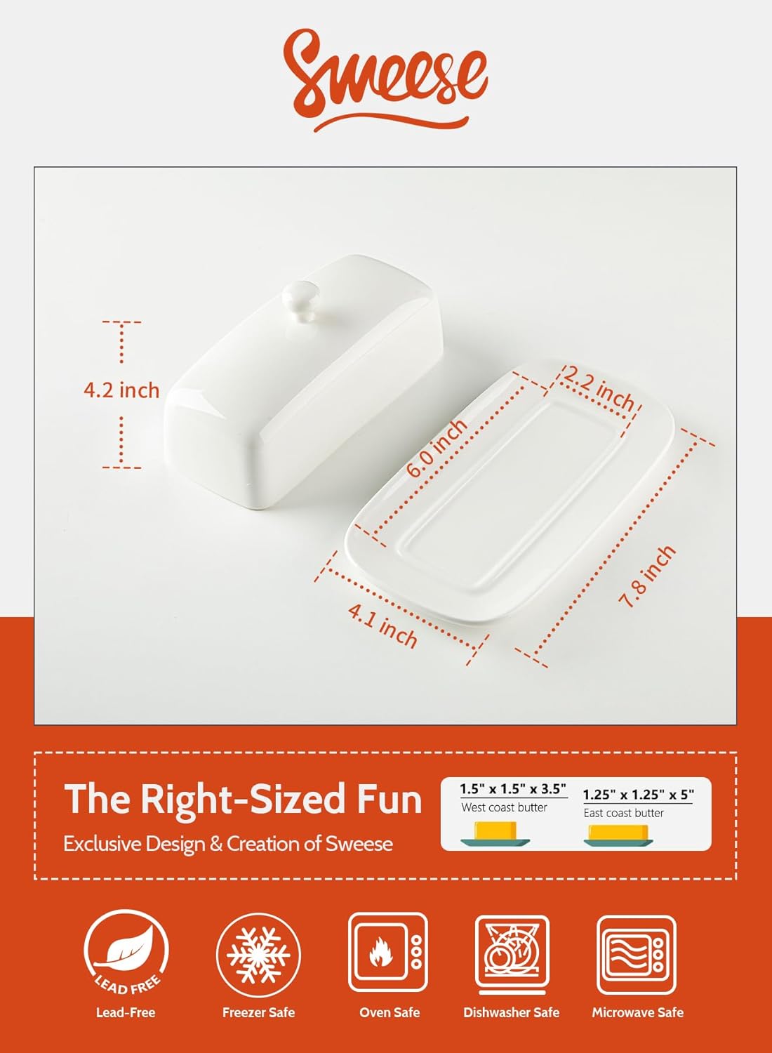 - Large Capacity - This butter holder is 7.8” long and 4.1” wide, and the 4.2" tall lid has enough capacity to easily accommodate a full "American size" stick of butter, including east/west coast butter; without worrying about the butter hitting the top or sides of the lid. A properly sized butter container can be conveniently placed in the refrigerator or counter space.