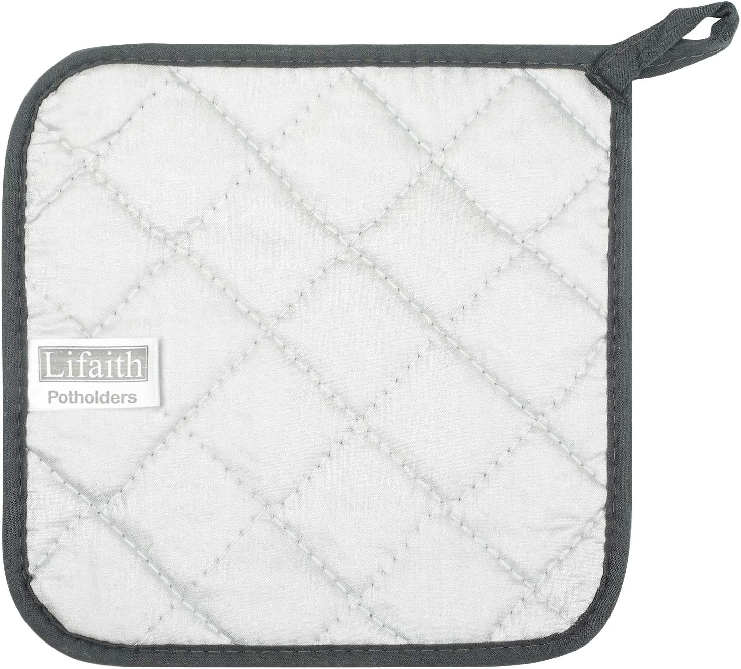 - 100% terry looped cotton on one side and a heat resistant silverstone lining on the other. Quilting allows for easy flexibility in this potholder, offer durability and grip. Hanging loop for easy storage.