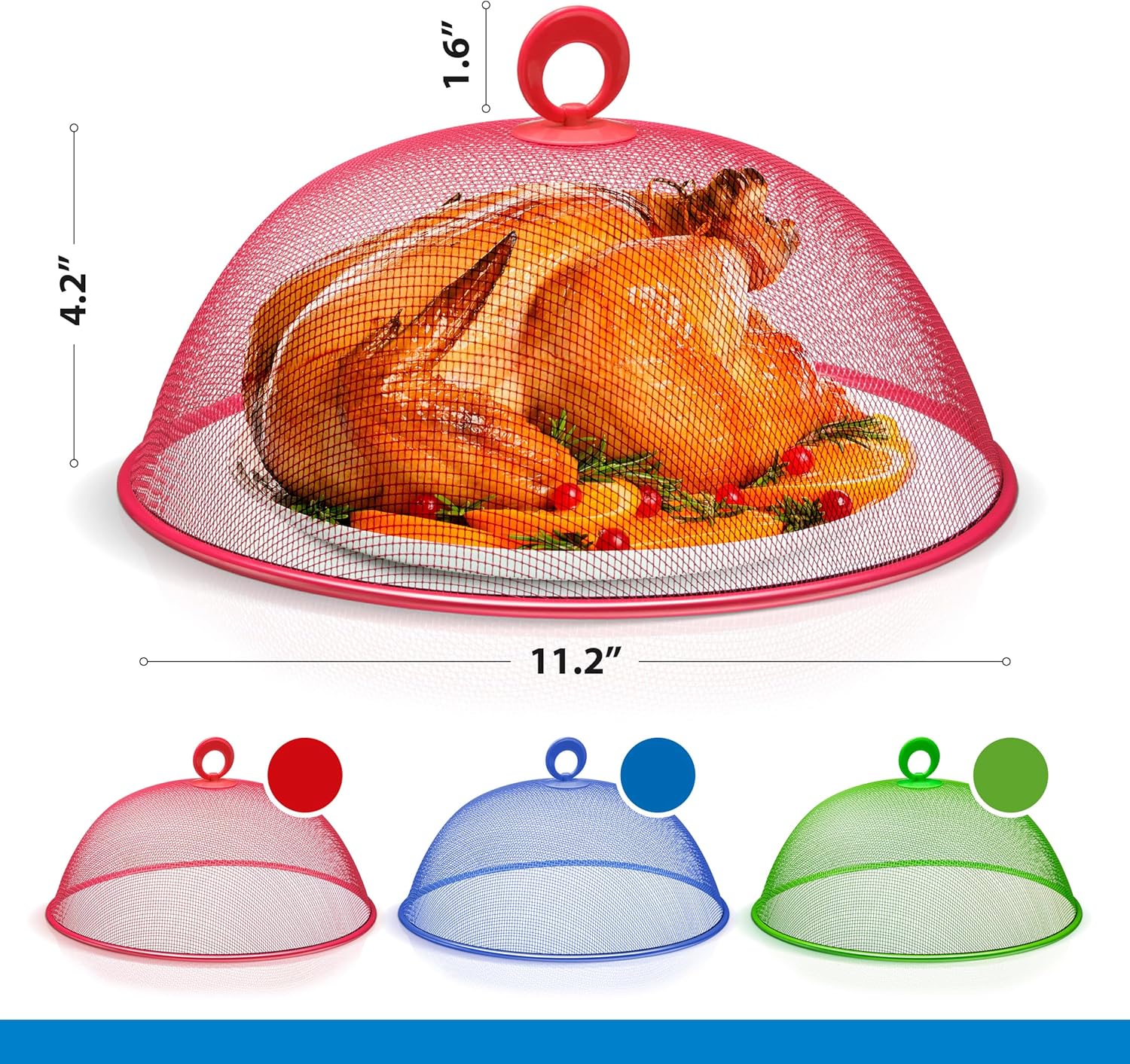 Metal Mesh Screen Food Cover Tent Umbrella, 10.75 inch, Reusable Outdoor Picnic Food Covers Mesh, Food Cover Net Keep Out Flies, Bugs, Mosquitoes (3 Pack, Green Blue Red)