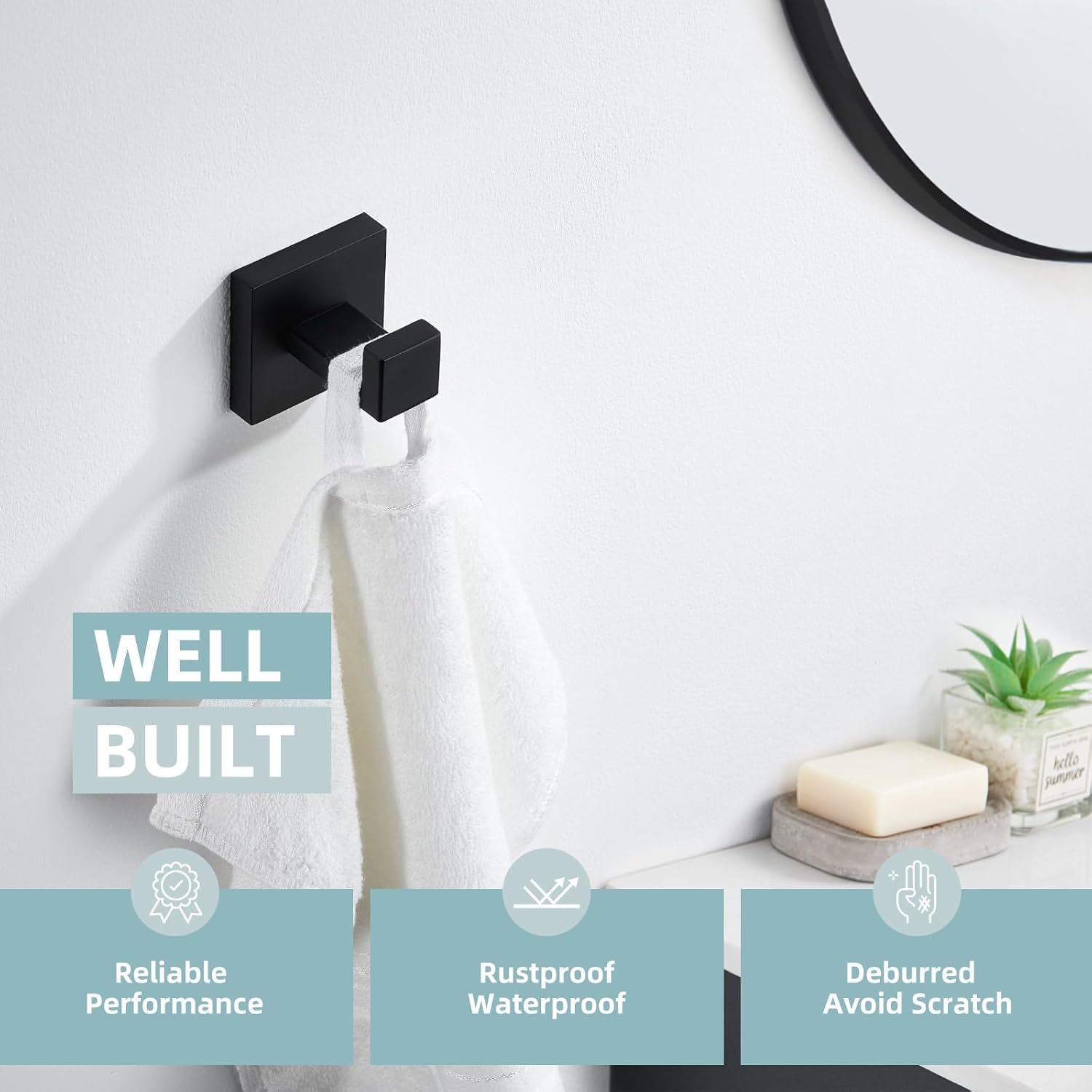 - STURDY CONSTRUCTION AND PREMIUM FINISH: our bathroom hook is solidly constructed of SUS304 stainless steel for durability and abrasion resistance, resists rust, corrosion and tarnish. Premium matte black coating for rustproof, not easy to fade.
