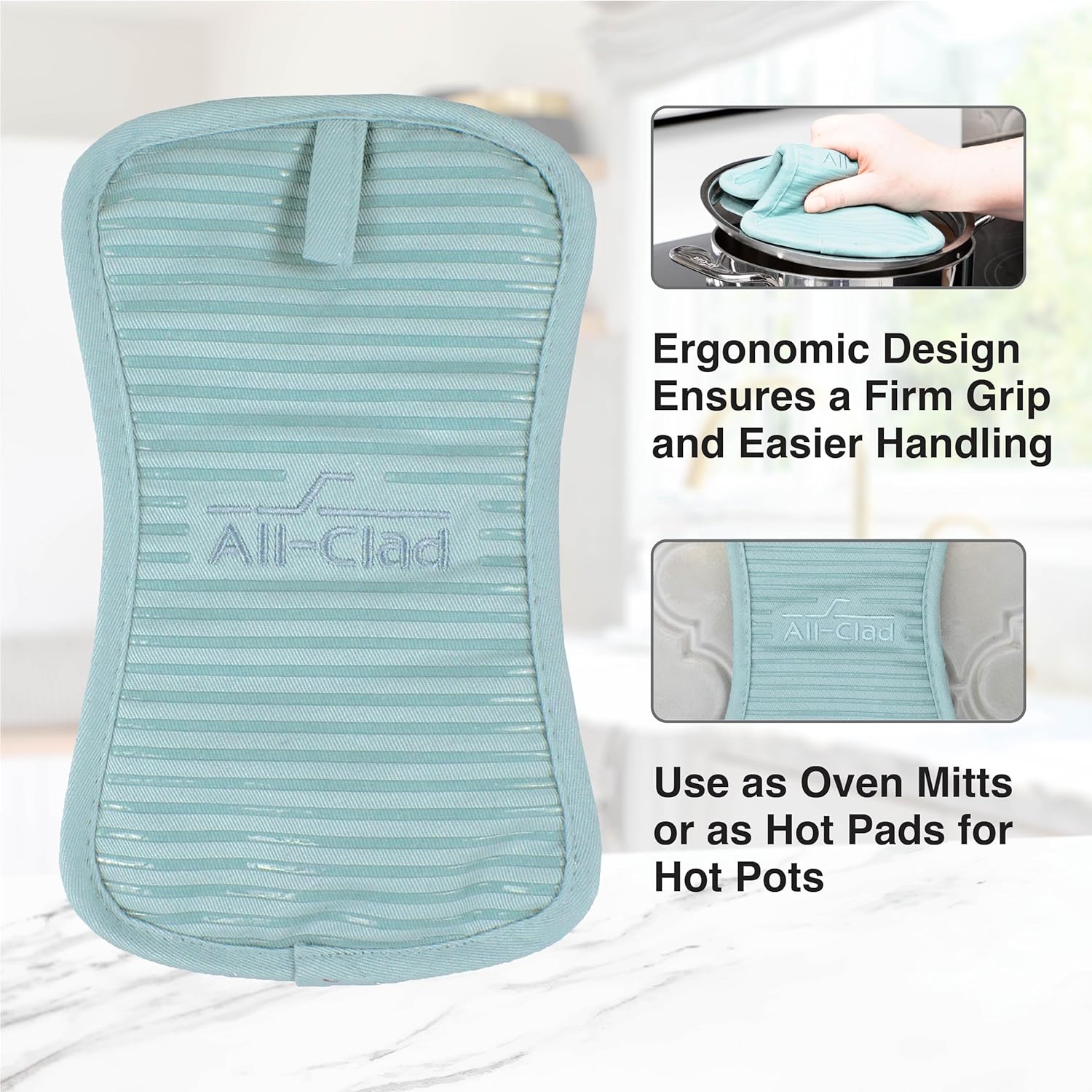 - A NAME YOU CAN TRUST. All-Clad revolutionized cookware by offering products used in kitchens around the world. Their premium heat protection kitchen accessories include silicone oven pot holders, oven mitts, kitchen hot pad mitts, and heat-resistant grips and holders
