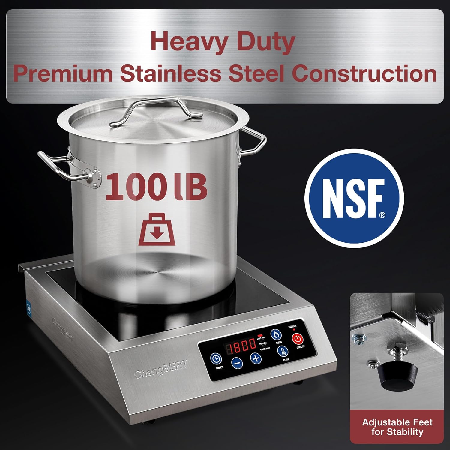 ChangBERT Portable Induction Cooktop 1800W NSF Certified Commercial Range Powerful Countertop Burner Pro Chef Professional Hot Plate Premium Stainless Steel Housing Schott Glass 10 Hours Timer