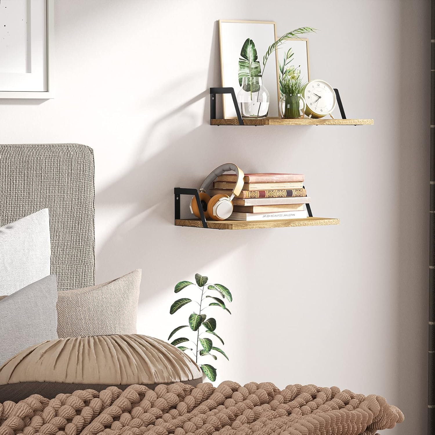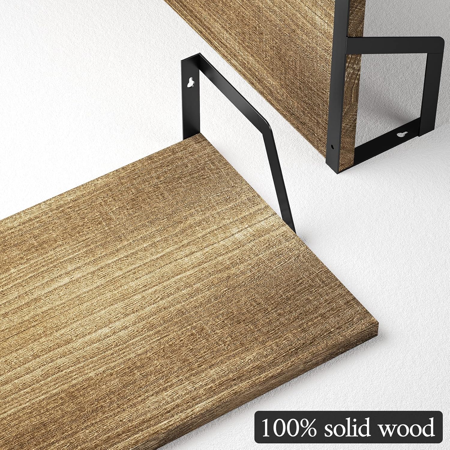 - Rustic Floating Shelves: The 2-set wall shelves will add a retro style to your home decor thanks to the torched wood and industrial metal brackets.