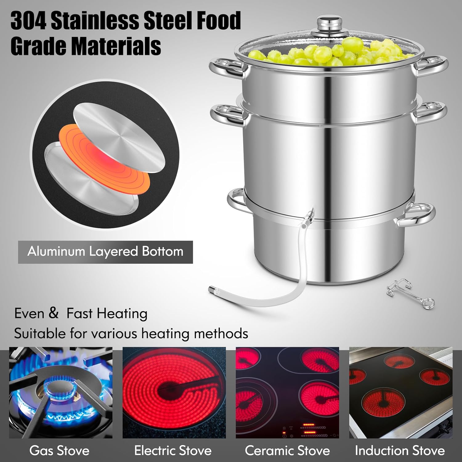- š[Powerful Capacity]- This juicer steamer can be used on any range. The stock pot can hold up to 11 quarts fruits or vegetables. Its flat aluminum-clad bottom for even heating is suitable for any cooktop including induction cooker.