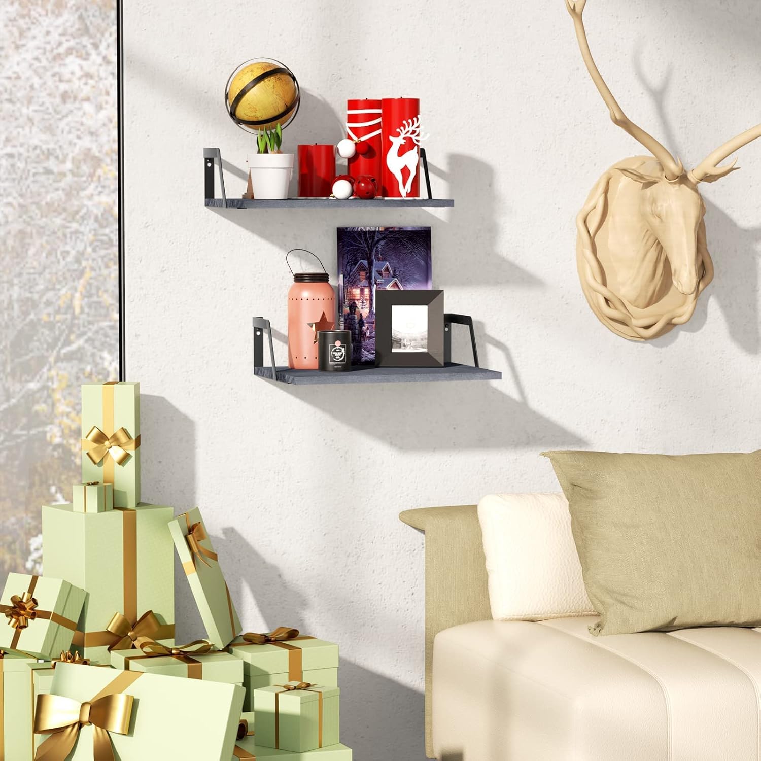 - Rustic Floating Shelves: The 2-set wall shelves will add a retro style to your home decor thanks to the weathered gray wood and and industrial metal brackets.
