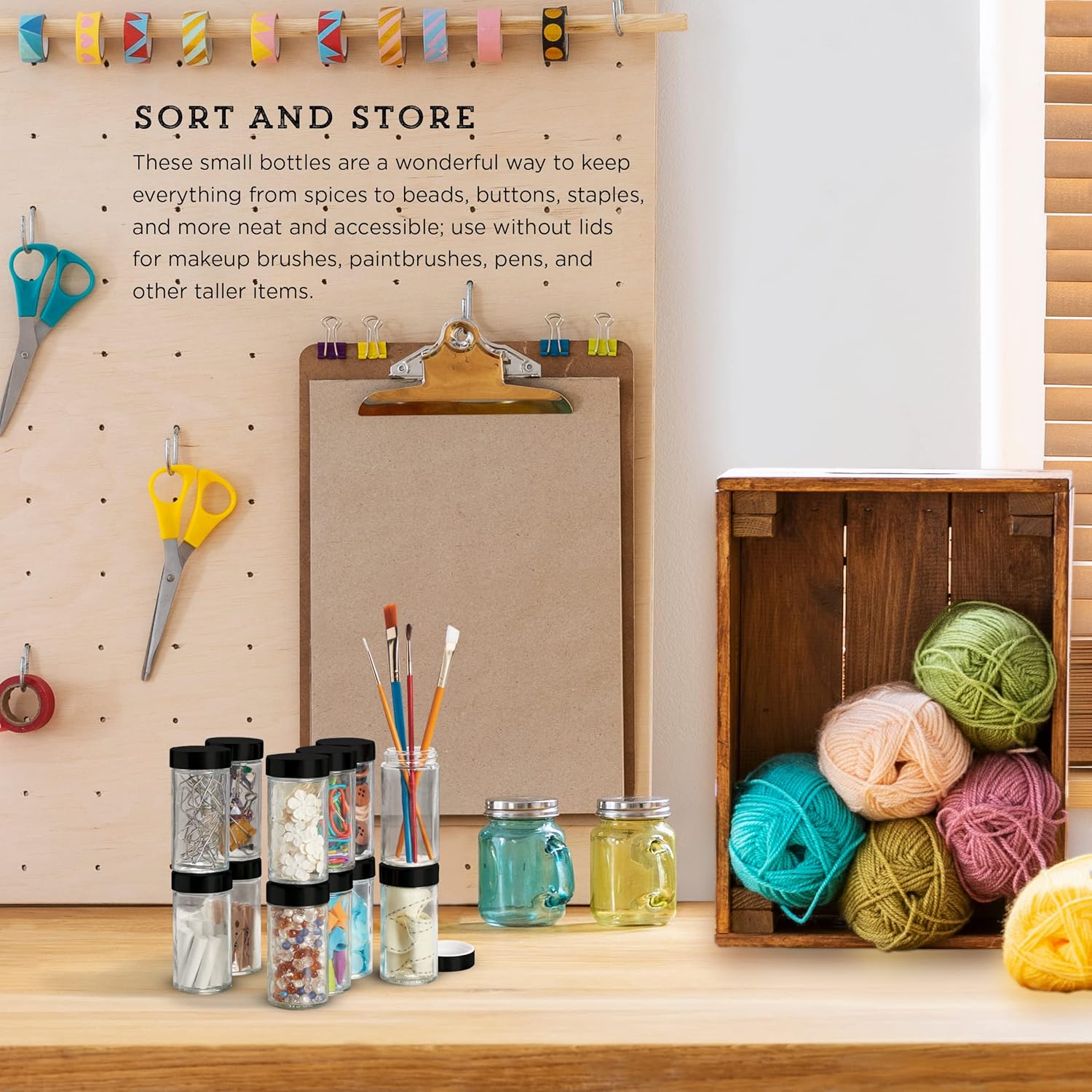 - SORT AND STORE: these small bottles are a wonderful way to keep everything from spices to beads, buttons, staples, and more neat and accessible; use without lids for makeup brushes, paintbrushes, pens, and other taller items