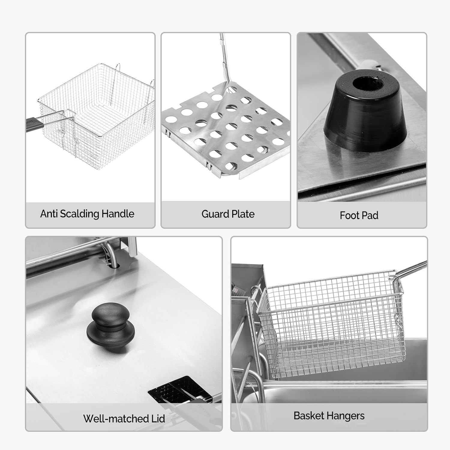 - DURABLE & EASY CLEANING:The countertop deep fryer, made of heavy duty stainless steel, is solid in construction. Thickened tank for durable use, can be detached for easy cleaning. (NOTE: There are white protective films on the surface that need to be removed before use. Please peel off the flms before use.)