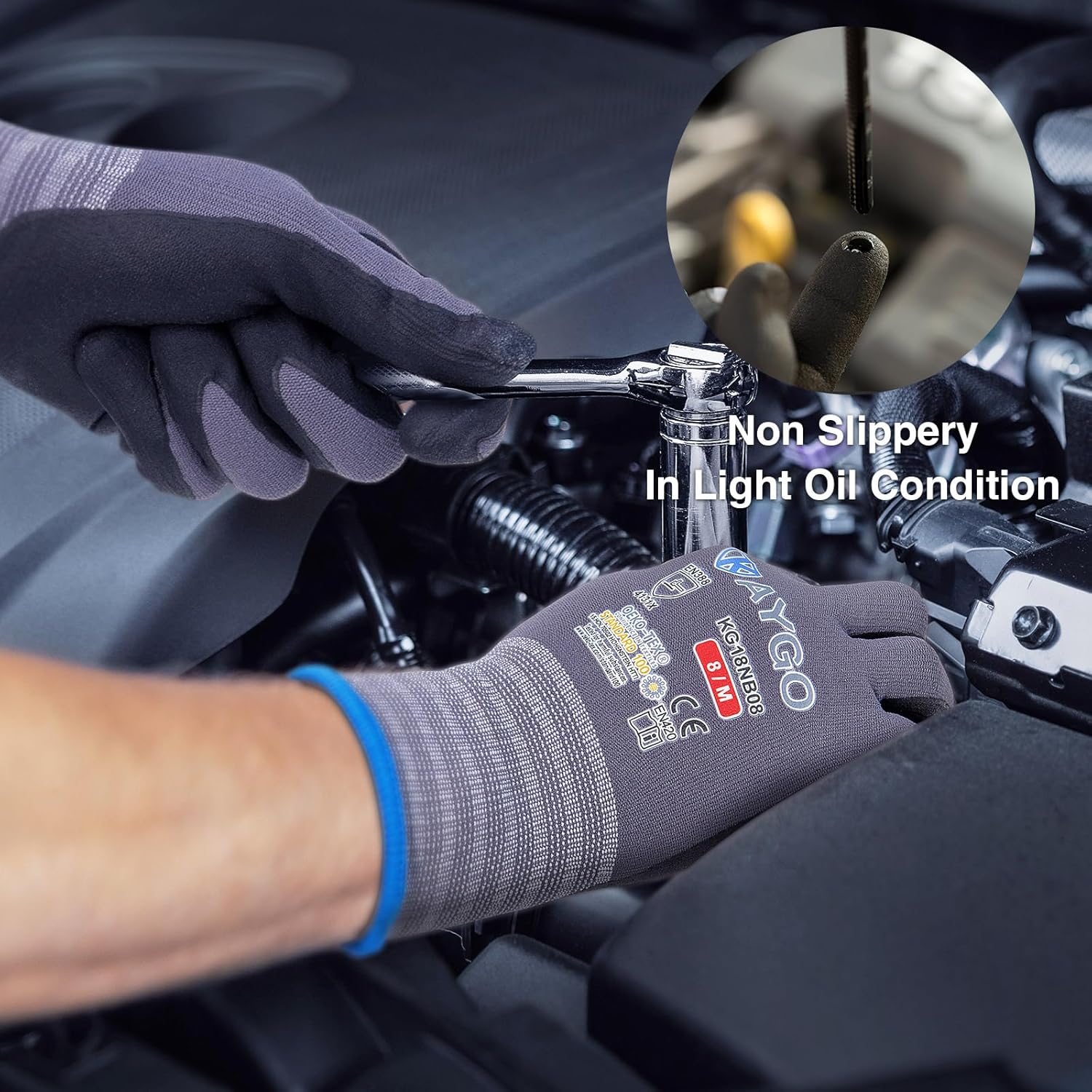 KAYGO Safety Work Gloves MicroFoam Nitrile Coated, 3 Pairs KG18NB,Seamless Knit Nylon Glove for Men and Women, Ideal for Automotive,Warehouse,Construction (Medium,Gray)