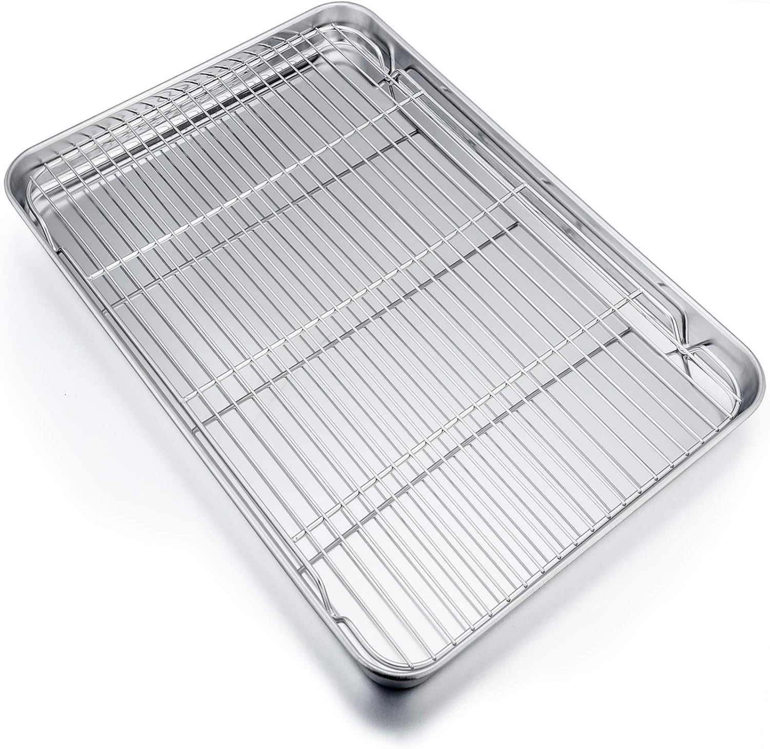 - 【EXPERTLY DESIGNED】The stainless steel baking pan has mirror finish polished, always keep a smooth and shiny surface, Rolled edges with no sharp spot, The wire rack with dense parallel lines to keep food from falling through