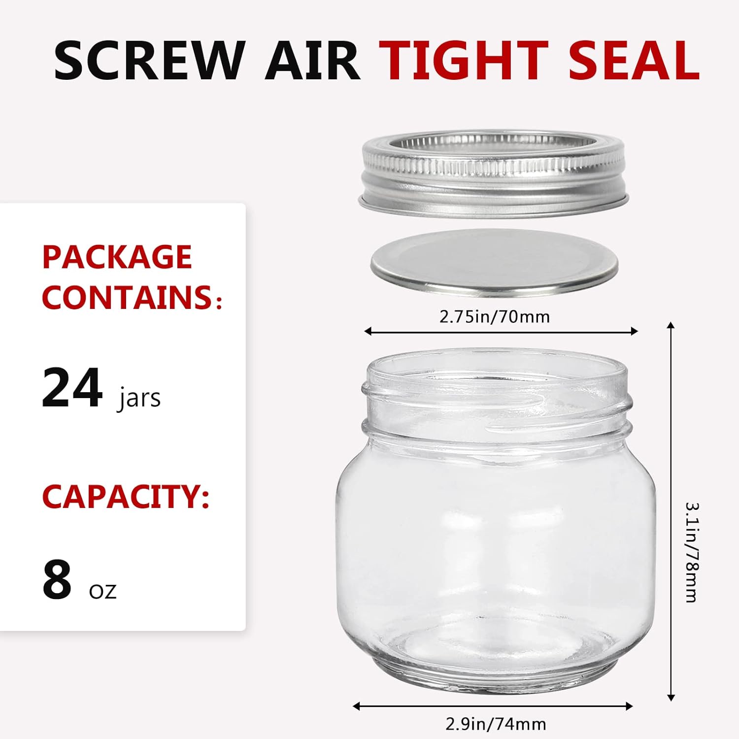 - Package include: 24 Pack 8oz/240ml mason jars with silver split-type screw metal lids; Size: 2.9 inch(Base Width) x 3.1 inch(Height) x 2.75 inch(Regular mouth)
