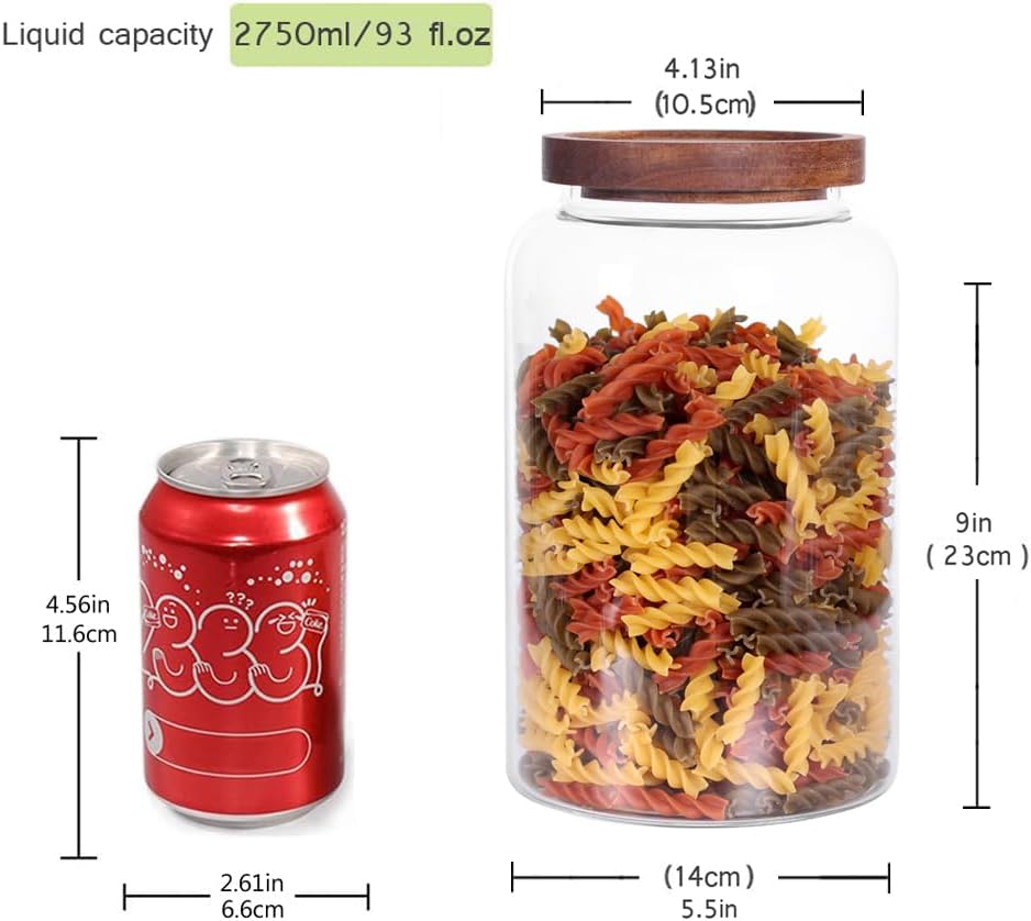 Large Glass Food Canisters, 93 FL OZ(2750ml) Kitchen Serving Stoarge Container with Airtight Wooden Lids, Cereal Dispenser Jars for Spaghetti Pasta, Powder, Spice, Tea, Coffee(8.8inch high)