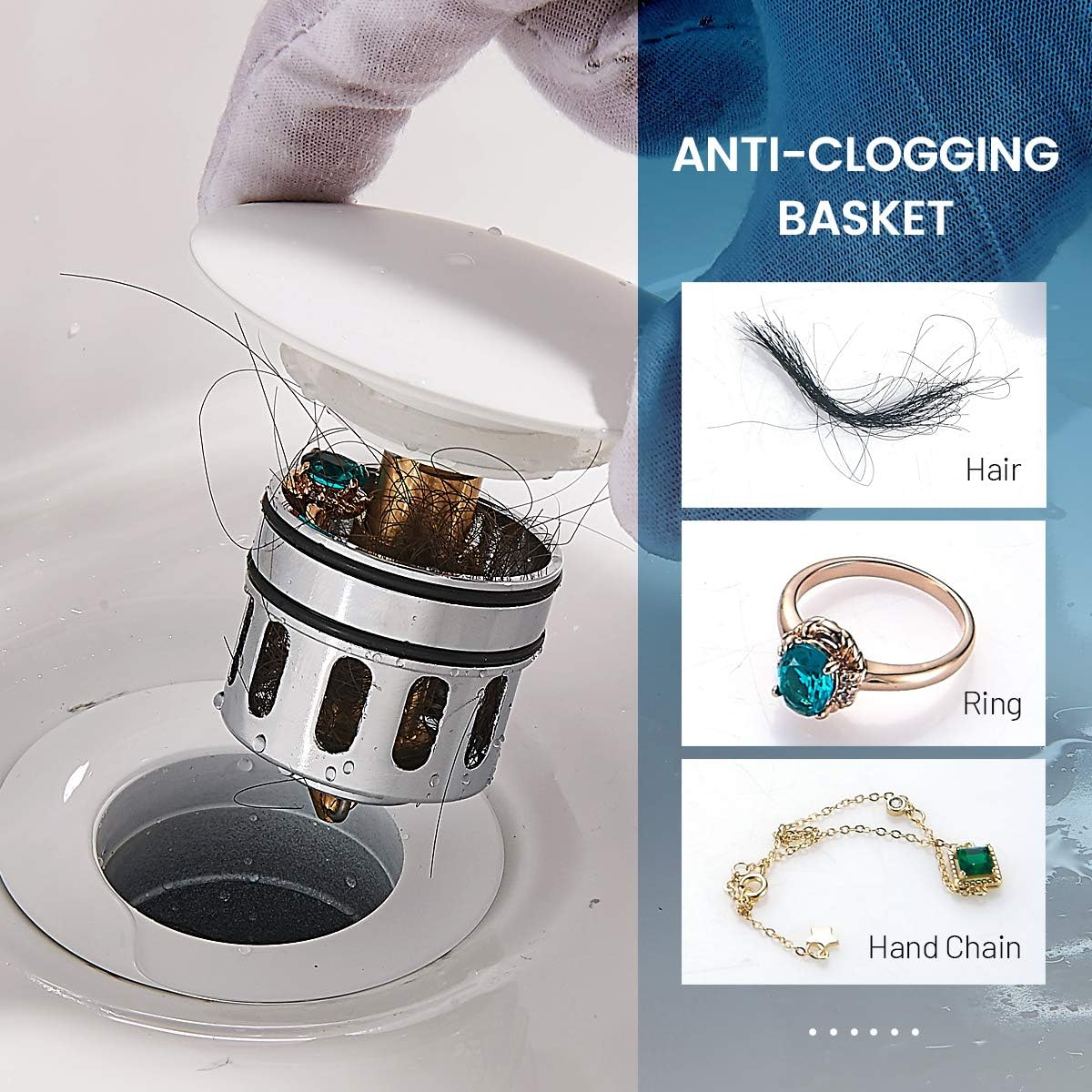 - 【BUILD-IN STRAINER】Unlike regular puch button drain,this drain stopper has a anti-clogging basket strainer inside that neatly collecting hairs and prevents the drain from clogging up,stuff will not get into the drain, such as jewelry, ring, dirt and so on.