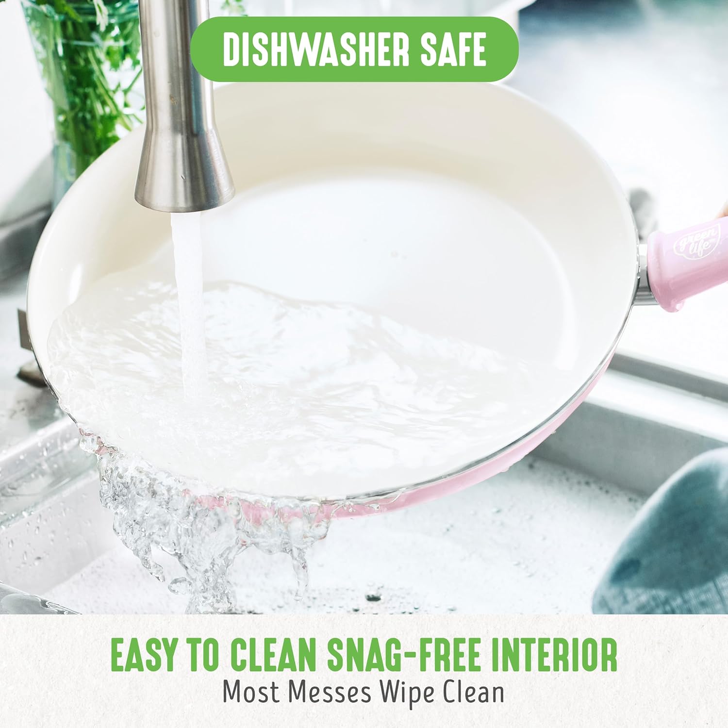 GreenLife 16 Piece Nonstick Cookware Set, Soft Grip Non-Toxic PFAS-Free Ceramic Pots & Pans, Dishwasher & Oven Safe, Frying, Sauce, Saute, Utensils, Glass Lids, Stay-Cool Handles, Wobble Free, Pink