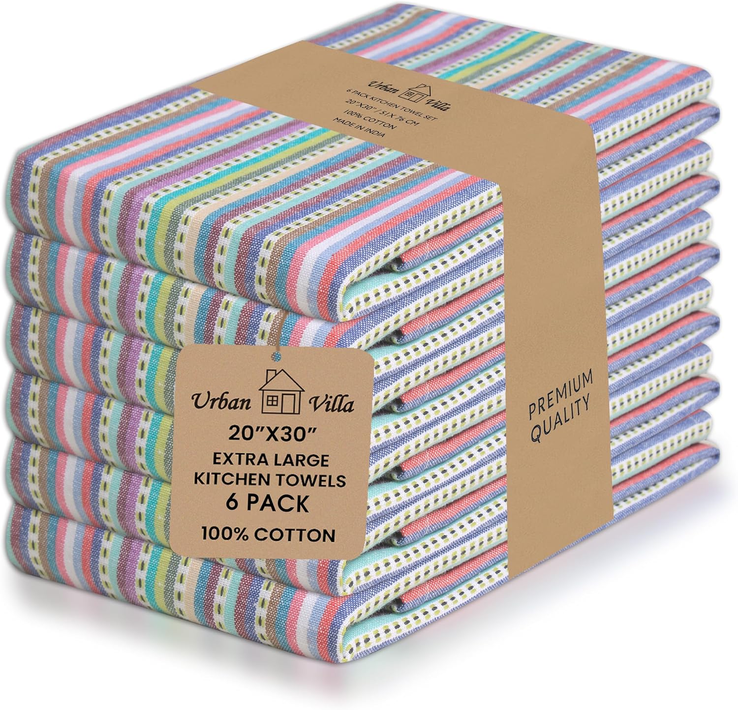 Urban Villa Kitchen Towels Blue Multi Dobby Stripes Premium Quality 100% Cotton Dish Towels Mitered Corners Ultra Soft (Size: 20x30 Inches) Highly Absorbent Bar & Tea Towels (Set of 6)