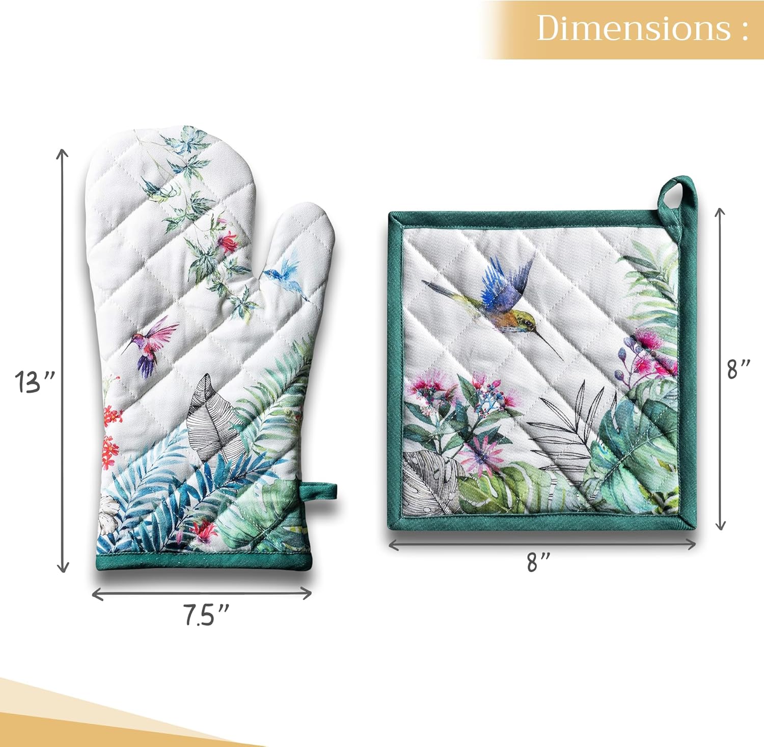 Maison d' Hermine 100% Cotton Oven Mitt & Pot Holder Set (7.5"x13" & 8"x8") Heat Resistant BBQ Cooking Gloves with Loop, Baking, Grilling, Kitchen, Handling Hot Pans Spring/Summer (Tropiques)