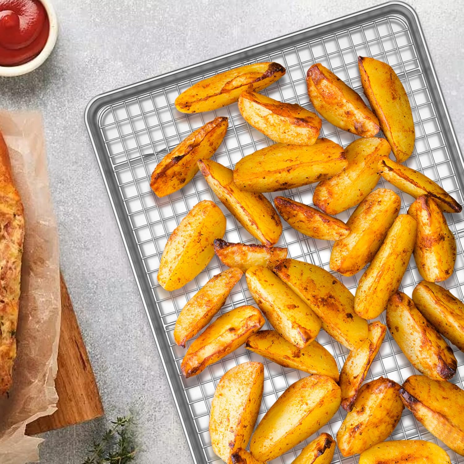 - PRODUCT INCLUDES: Including 2 baking sheet 40.7 X 30.8 cm (16.02 x 12.13β), 2 cooling rack 38.7 X 28.5cm (15.24 x 11.22ββ), perfect to be used as cookie sheet or baking sheet for your regular oven and toaster oven