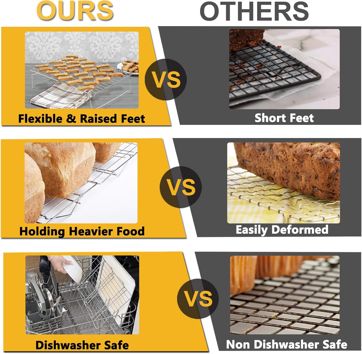 - FLEXIBLE & RAISED FEET - The flexible feet can be swung over 90°, Come with 3.5-inch height when it expanded fully, Make the rack stack stably on another rack, Provide higher and larger space to cool and bake more food at once, Collapsible feet for easily folding to 1.3-inch height, Easy storage in your cabinet or drawer