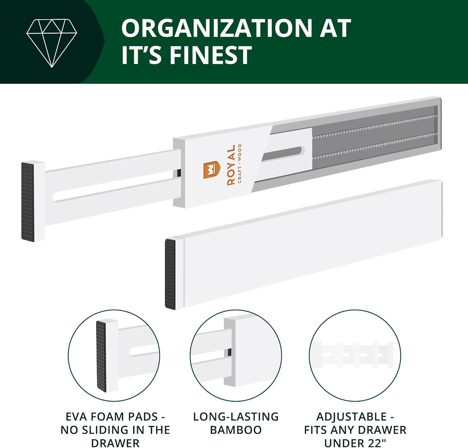 - 💎 ULTIMATE STORAGE SOLUTION FOR ANY DRAWER: Royal Craft Wood has created the perfect economical solution to help organize and sort both small and large accessories. Built of premium bamboo materials, these are the only drawer section sorters you will ever need, made to last for years! Built-in EVA foam padding on either end keeps each piece securely in place, ensuring your items don’t get mixed together from constant use, while also preventing damage from scratches on the original drawer