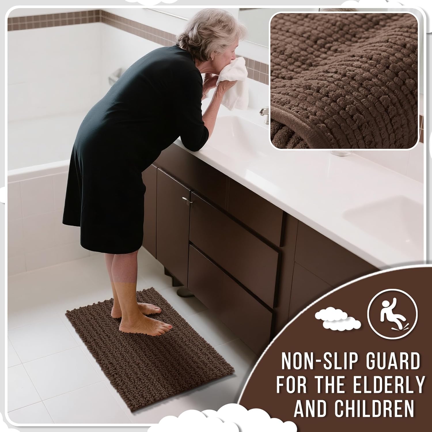 Yimobra Large Bathroom Rugs Non Slip Washable 36x24 Inch - Ultra Soft Absorbent Chenille Bath Mat, Quick Dry Shaggy Floor Carpet for Tub Shower, Brown Home Decor Accessories