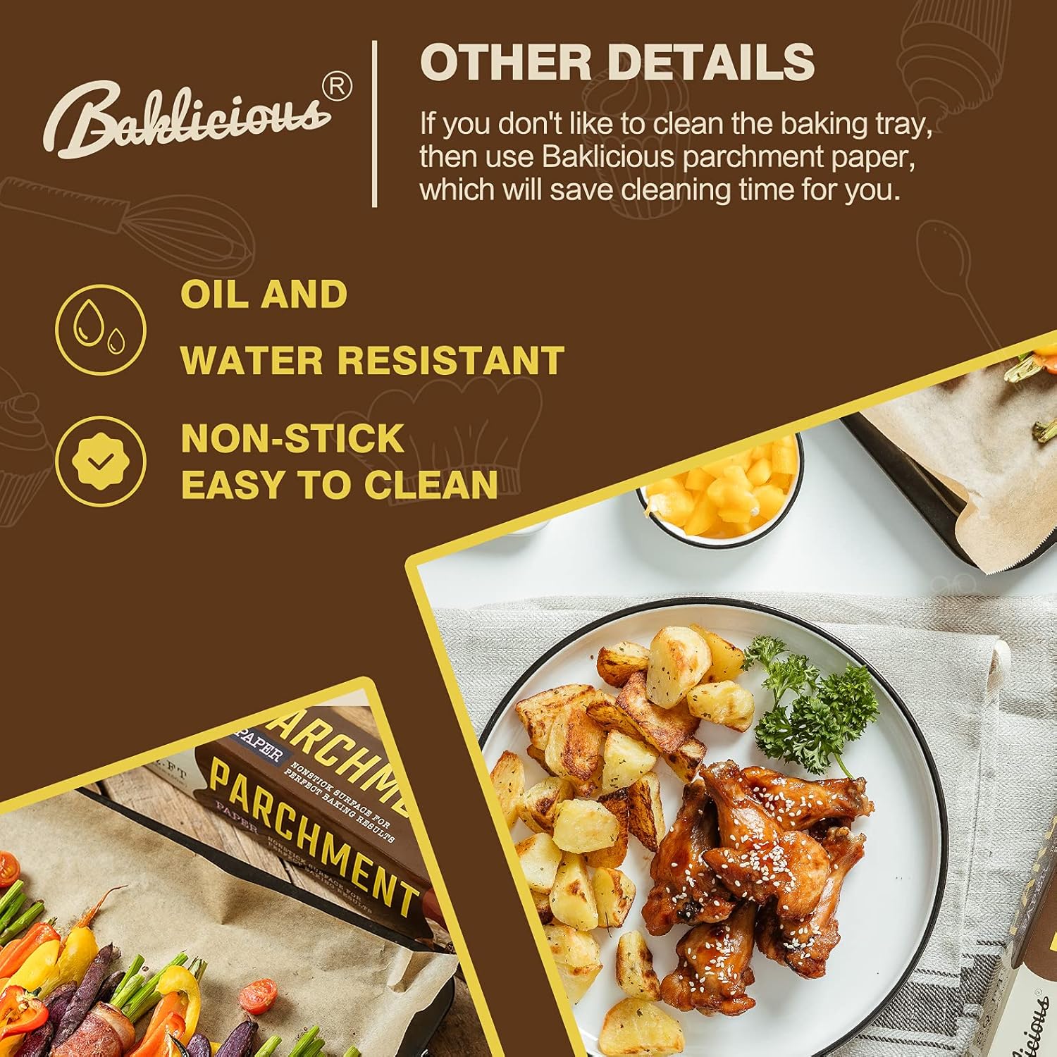 - NON-STICK--Grease&water proofing Baklicious parchment paper roll for baking apply food grade silicone oil on both sides that eliminates the food sticking to the paper during baking. Processed food by Baklicious nonstick parchment paper with almost no clean up.