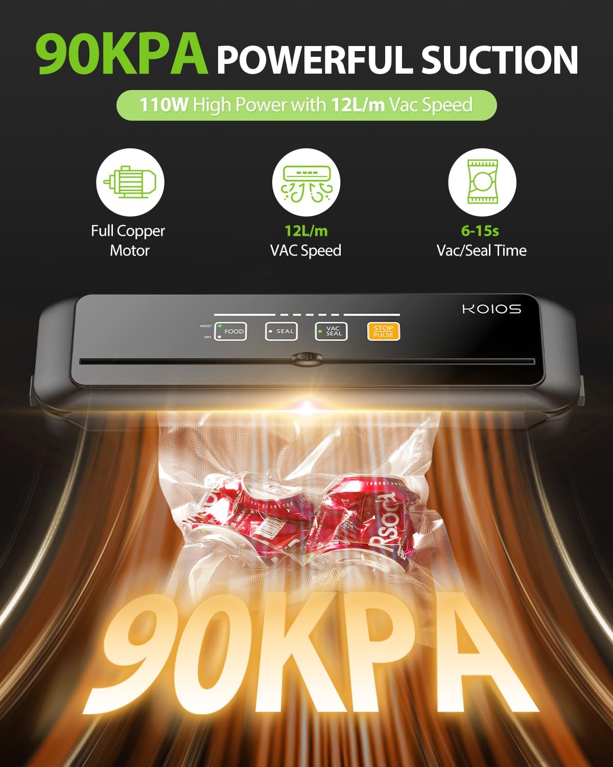 KOIOS Vacuum Sealer Machine, 90Kpa Automatic Vacuum Air food sealer/Built-in Cutter Starter Kit, Dry & Moist Food Preservation Modes, Pulse Function, LED Indicator Lights, Black