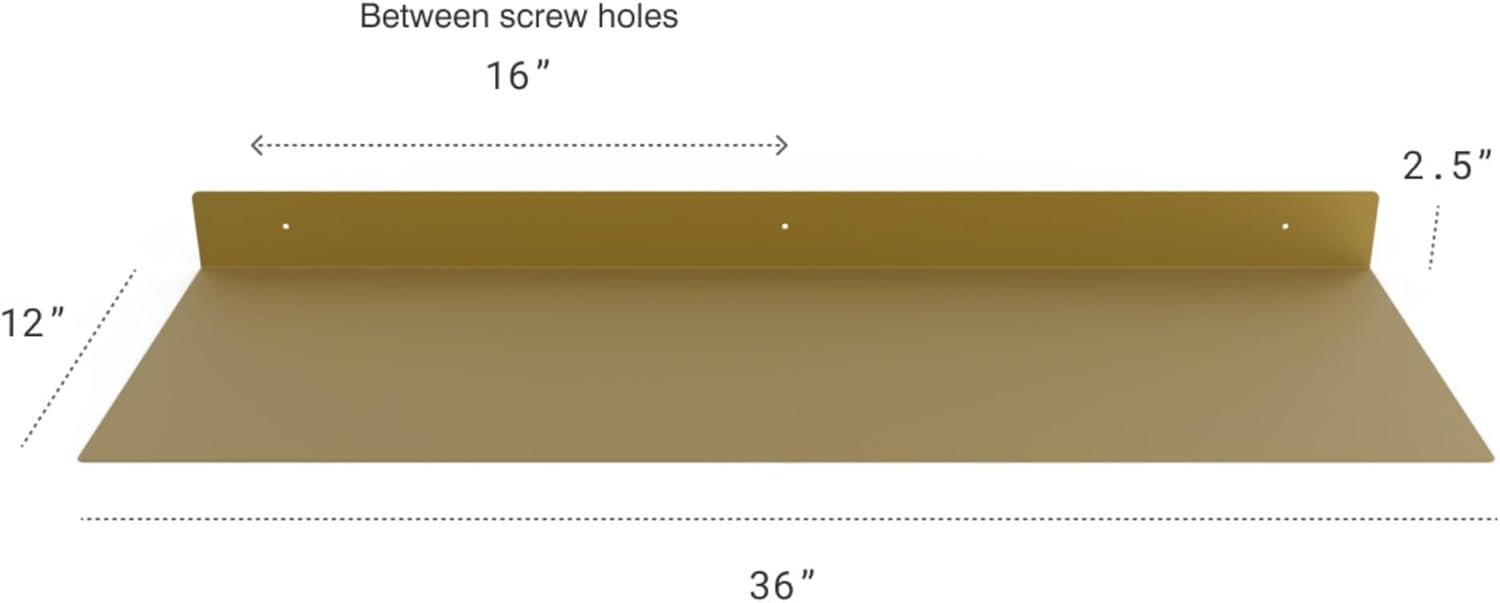 - DIMENSIONS & DETAILS: Measuring 36-inches long x 12-inches in depth, our steel floating shelf is made from 14 gauge raw steel and professionally powder coated gold. The weight of the shelf is 11 LBS. It's perfect for displaying books, plants, bottles, picture ledges, and retail displays