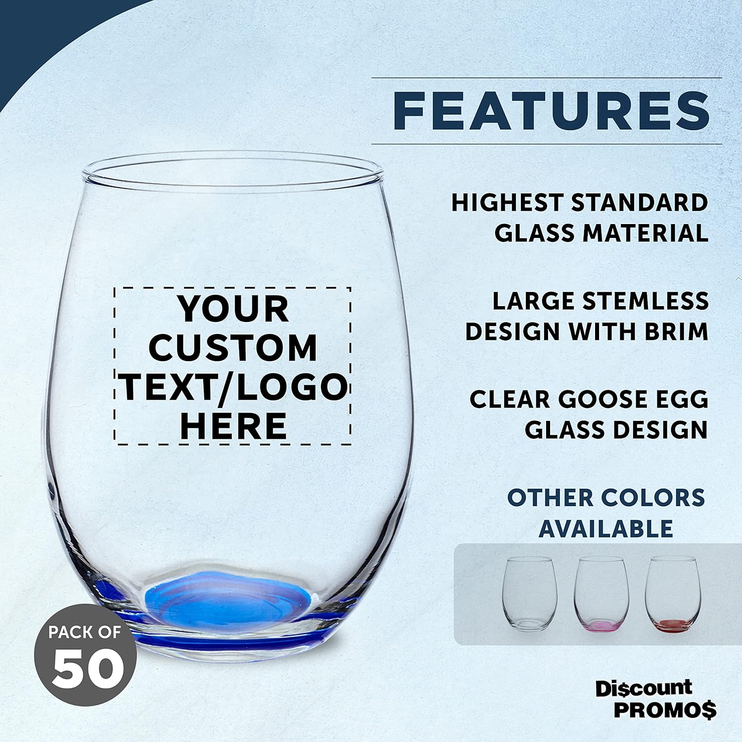 Custom Stemless Wine Glasses in Bulk by ARC Perfection, 15 oz, 50 pack, Personalized Text, Logo, Red or White Wine Glass Set, Blue