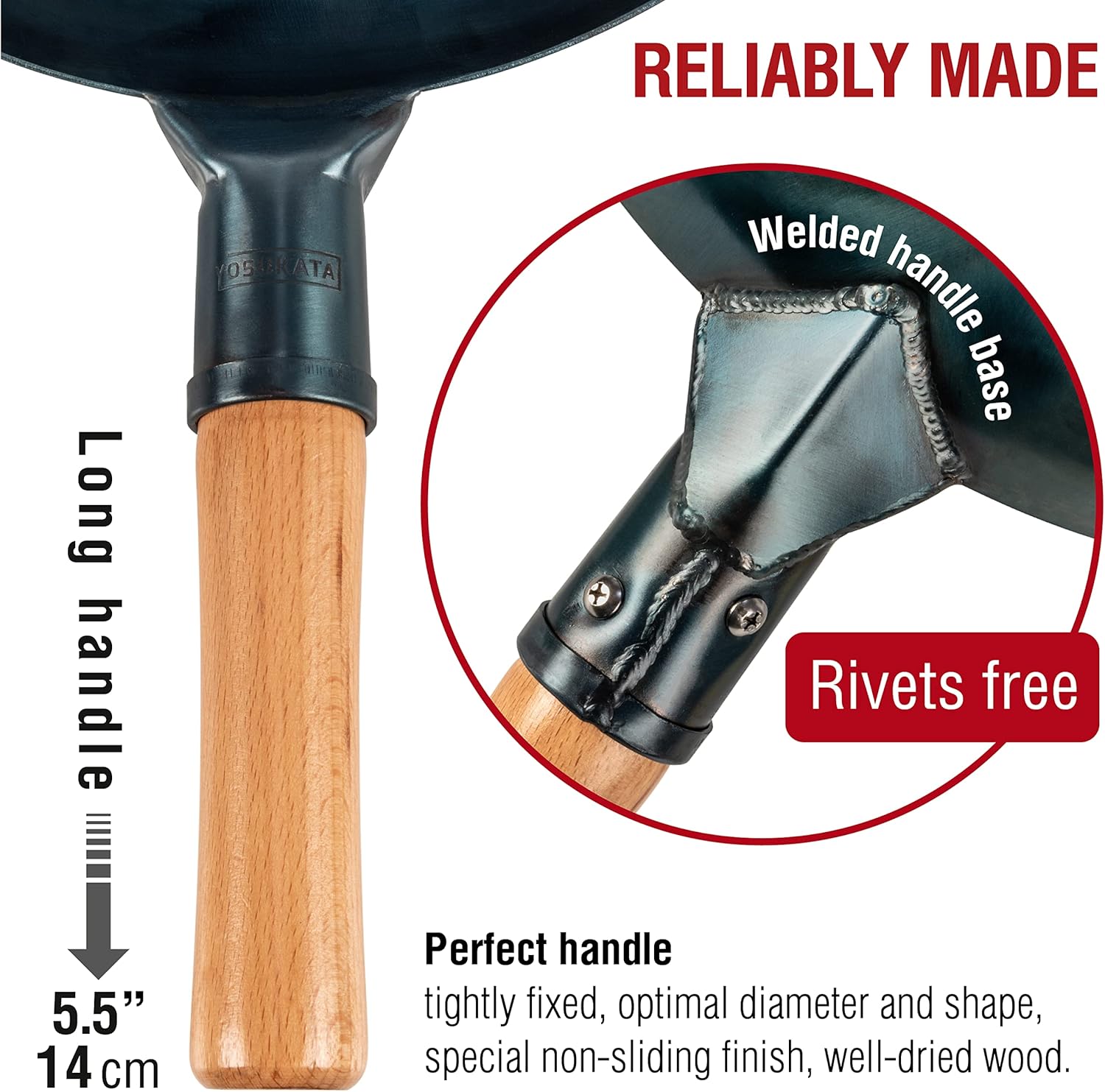 - SECURE GRIP: The long handle of our carbon steel wok pan is tightly fixed through welding. Also, it combines optimal diameter and shape, a special non-sliding finish, well-dried wood.