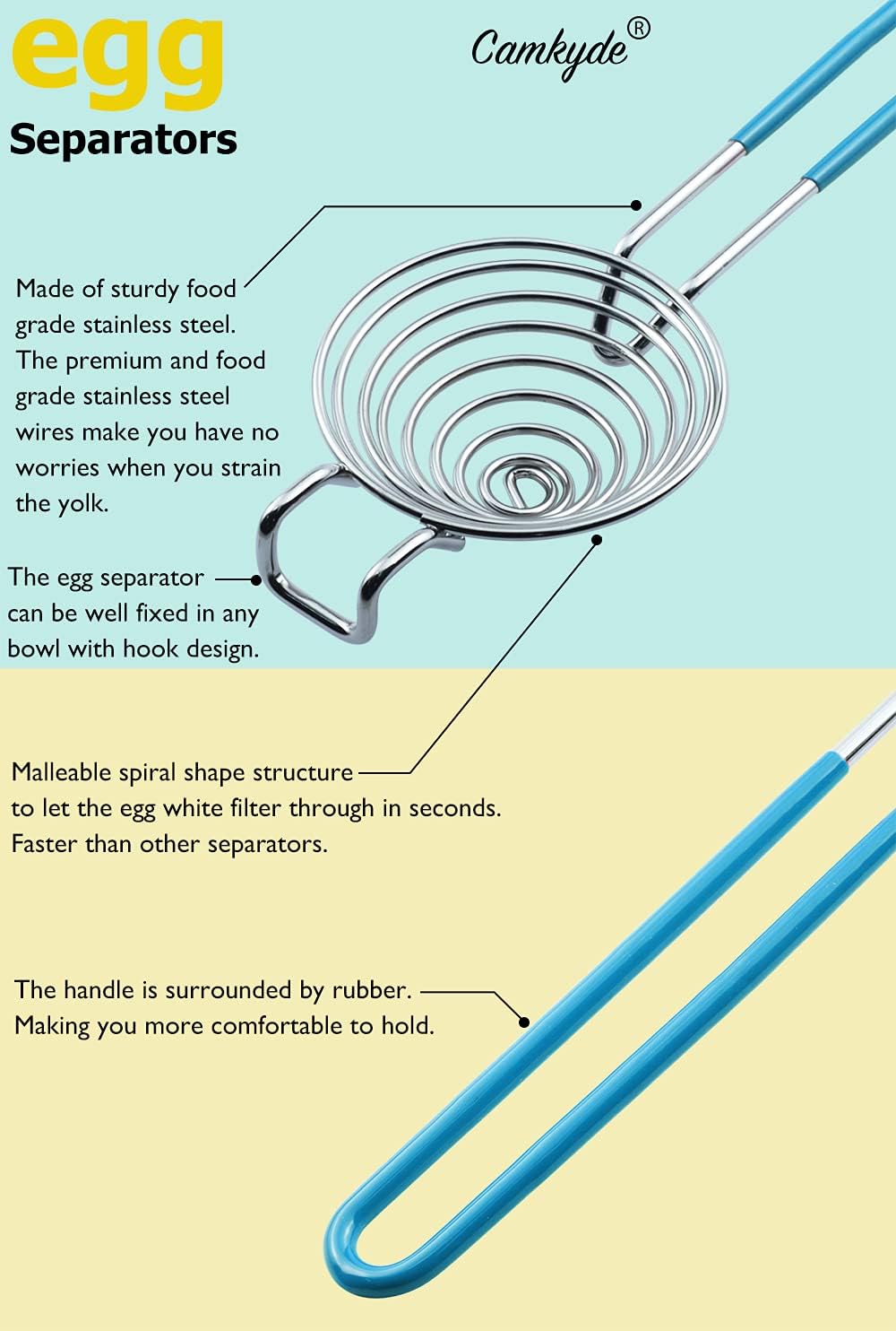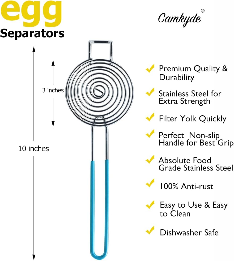 - MORE SAFE AND EFFICIENT. If you have used other egg extractor, then you must know that egg whites are difficult to filter and you need to shake the separator for a long time. But for the CAMKYDE Egg Yolk Separator, you no longer need to shake the separator, and the egg yolk is filtered instantly. Heavy duty and durability egg yolk white separator give you quality use for years to come.