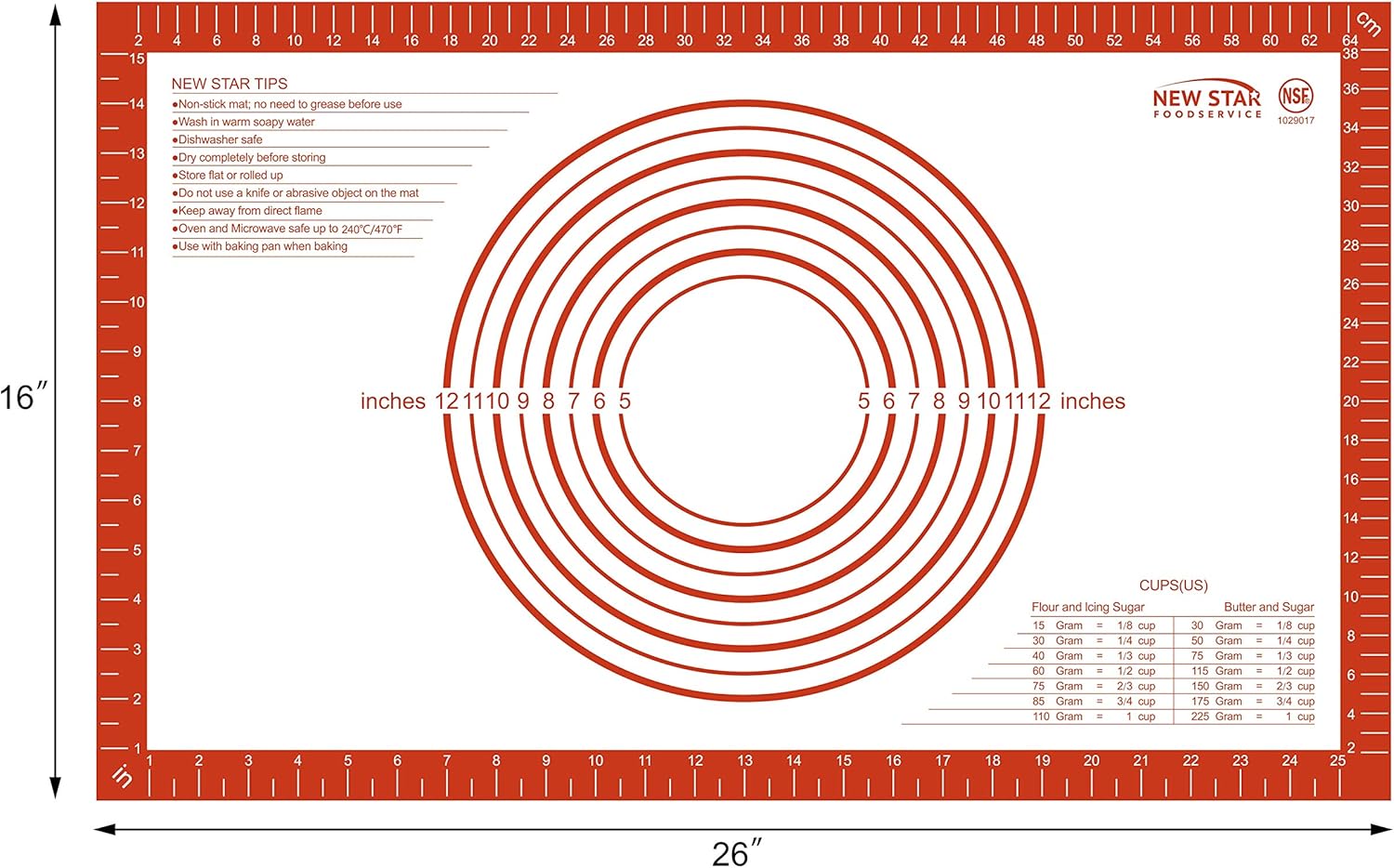New Star 1029017 Non-Slip Silicone Pastry Mat, Extra Large with Measurements, 16x26'', NSF Certified