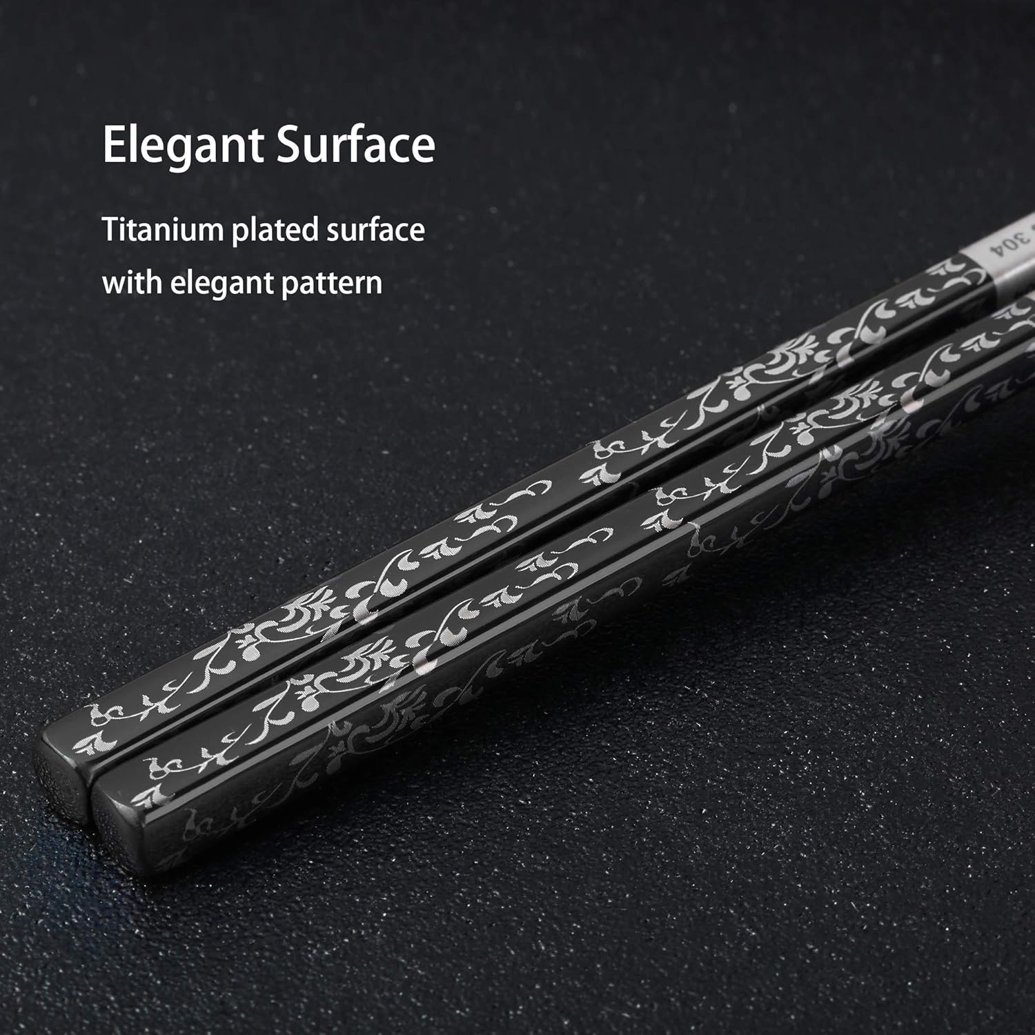 - ✿ 【Elegant Pattern】: The metal chopsticks are made of SUS304 stainless steel with laser engraved flower vine pattern on the titanium plated black surface. Titanium is an excellent material that is used on premium flatware. It is a permanent plating. No peeling or discoloration after a long time of use. The titanium plating on the stainless steel chopsticks makes the reusable chopsticks sturdier and not easy to scratch. The stainless steel chopsticks are sturdy, reusable, almost indestructible.