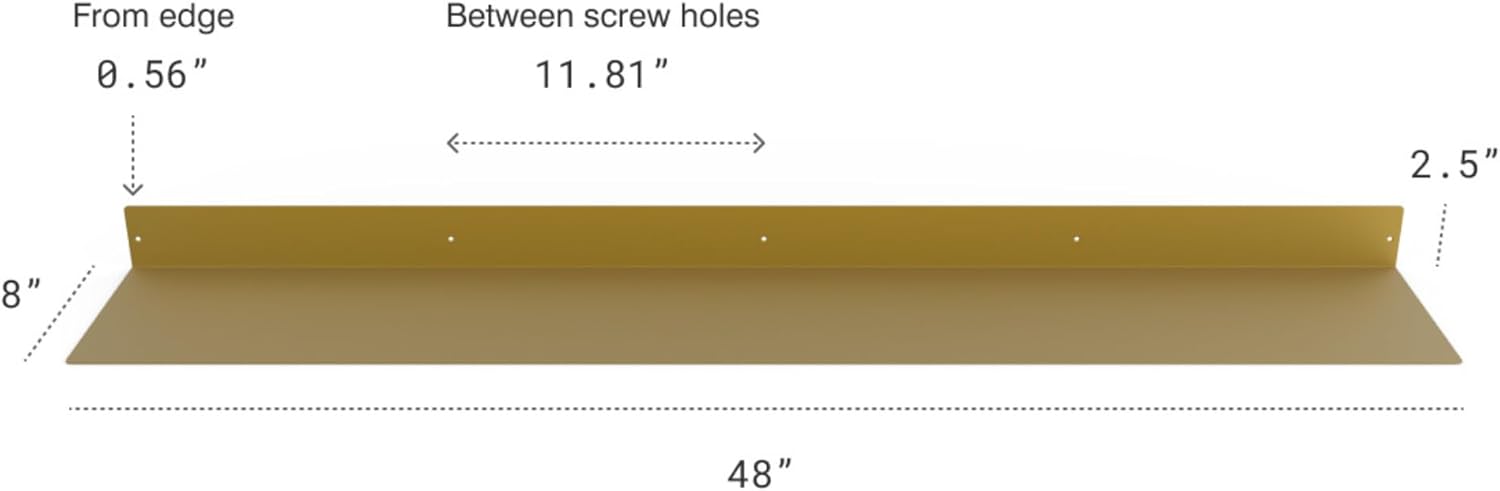 - DIMENSIONS & DETAILS: Measuring 48-inches long x 8-inches in depth, our steel floating shelf is made from 14 gauge raw steel and professionally powder coated gold. The weight of the shelf is 10.25 LBS. It's perfect for displaying books, plants, bottles, picture ledges, and retail displays