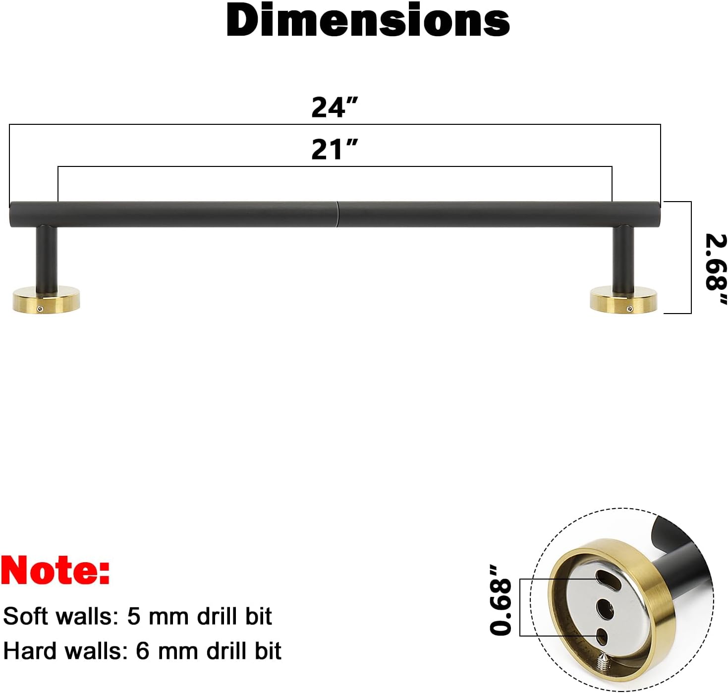 - DIMENSIONS & USE: Overall length is 24" (609mm); The length of hanging space is 21" (535mm); 22-Lbs (10kgs) max weight capacity; You can mount this towel bar to either side of your cabinet or closet door for storing at-use hand and dish towels; It can also be used with S hooks, hanging bath balls, hair dryers, tea cups, spoons, clips, etc