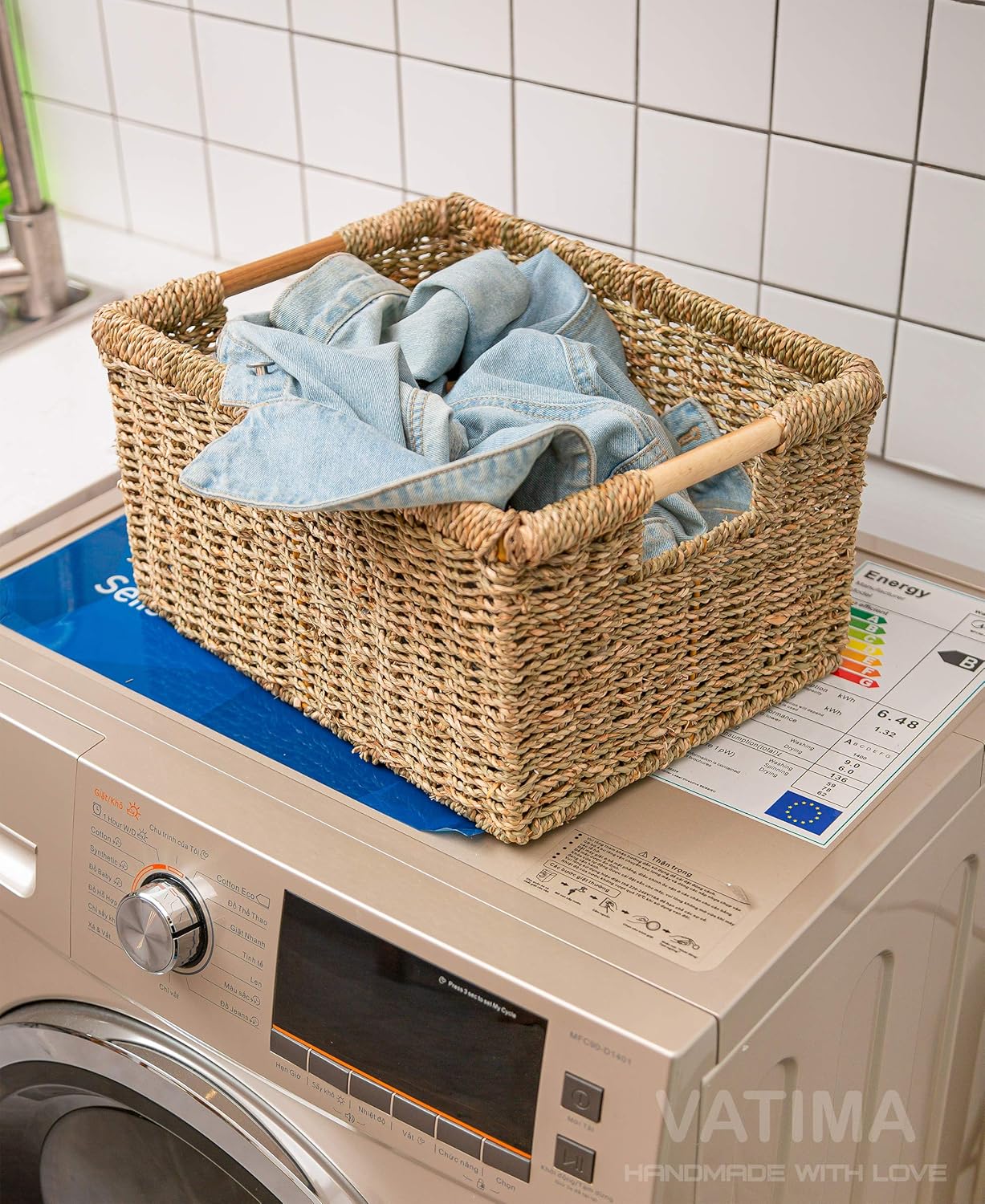 - ā WICKER BASKETS - Whether it be by way of pure decor, storage, or organization for kitchen, pantry, or bathroom. This natural Seagrass basket suit your home in every way. The rectangular storage basket is great for magazines, games, pet toys, media, household items.