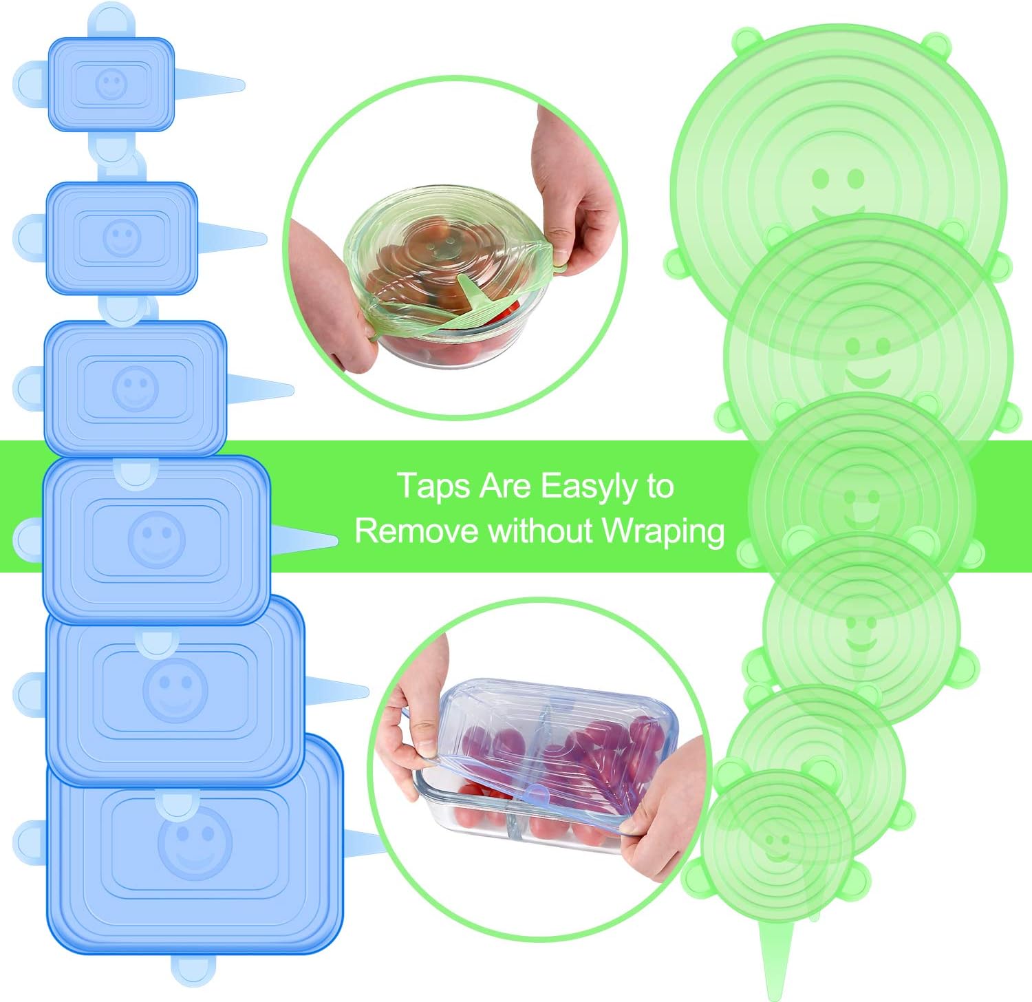 Silicone Stretch Lids, 12 Pack Silicone Lids, 6 Sizes BPA-free Silicone Bowl Covers Reusable for Cups, Bowls and Dish, Flexible, Round and Rectangle Fit 2.8” - 8.2” Container, Green & Blue