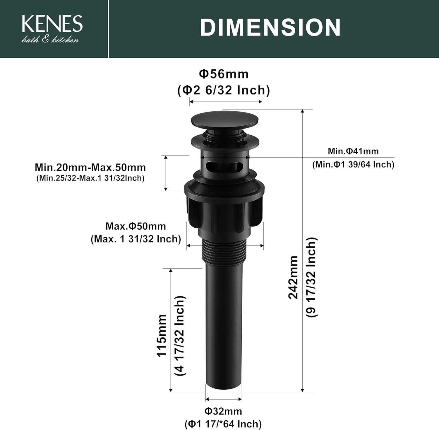 KENES Pop Up Bathroom Sink Drain with Overflow, Matte Black Pop Up Drain Stopper Anti Clog Pop Up Drain Stopper Lavatory Bathroom Vanity Sink Drain