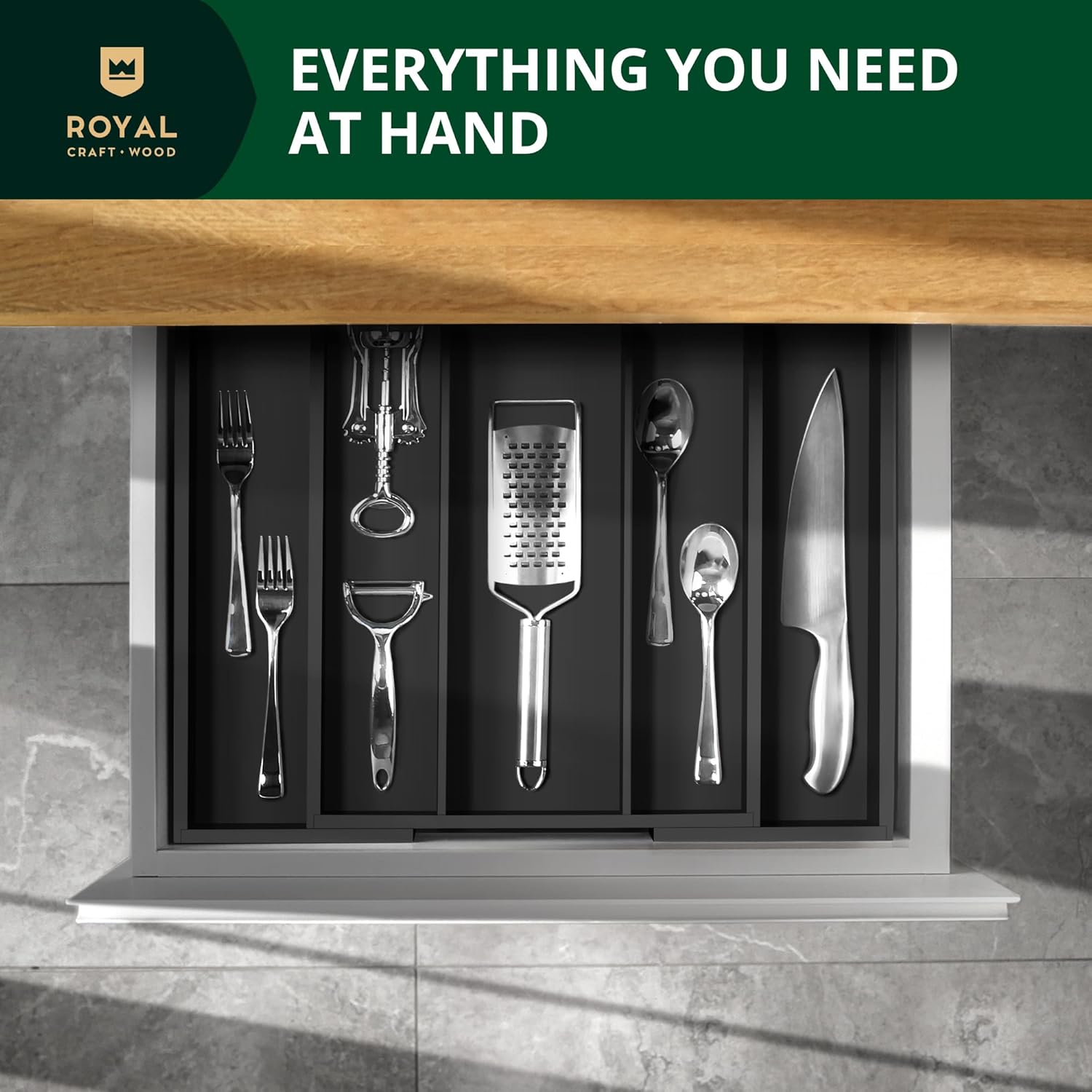 ROYAL CRAFT WOOD Luxury Bamboo Kitchen Drawer Organizer - Silverware Organizer - Utensil Holder and Cutlery Tray with Grooved Drawer Dividers for Flatware and Kitchen Utensils (5 Slot, Black)
