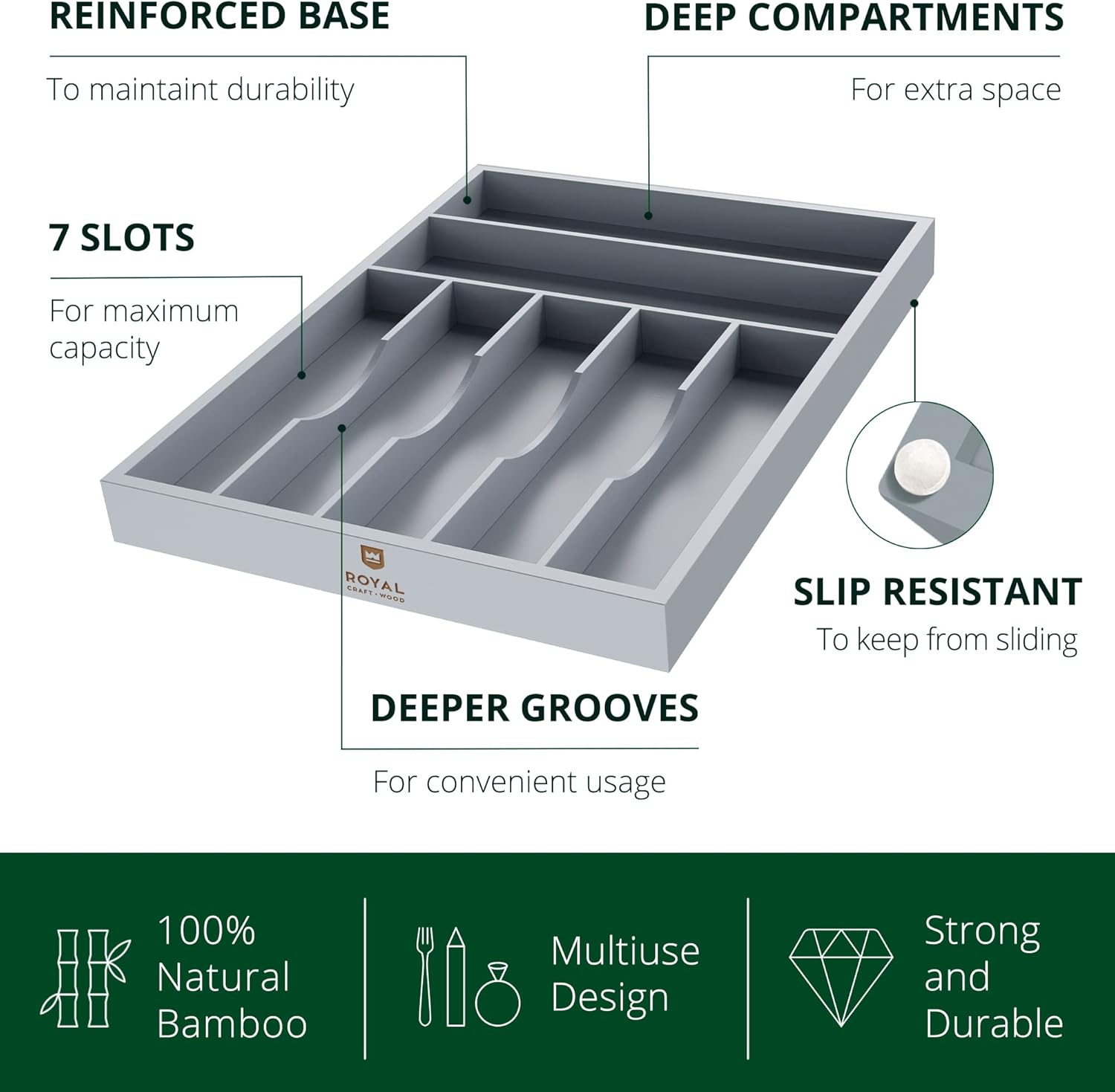 ROYAL CRAFT WOOD Luxury Bamboo Kitchen Drawer Organizer - Silverware Organizer - Utensil Holder and Cutlery Tray with Grooved Drawer Dividers for Flatware and Kitchen Utensils (7 Slot, Gray)