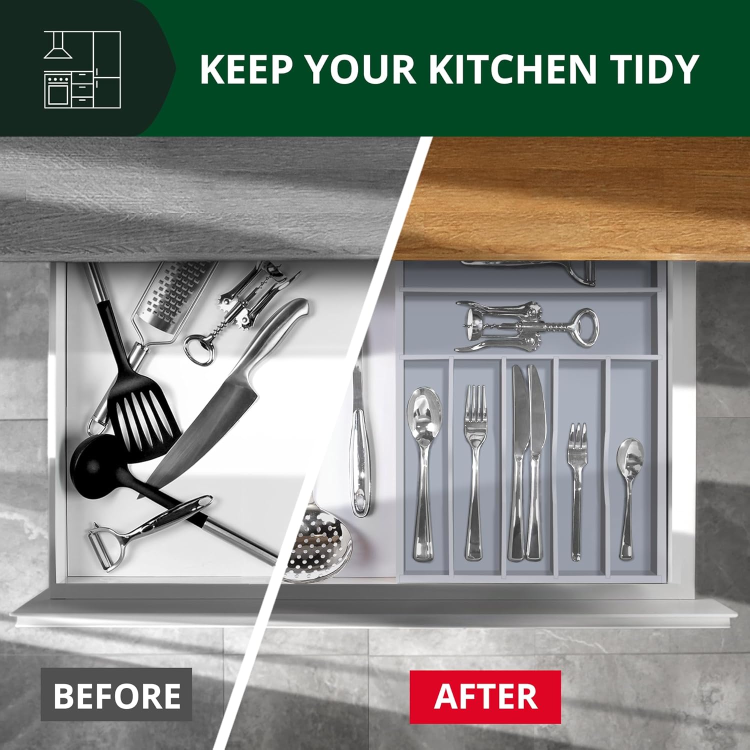 - πππππ πππππππ ππππππππππππ πππ πππππ πππππ ππππ: 1.9β deep dividing slots help maximize drawer space, allowing you to fill each section with more kitchen gadgets and tools. Keep everything you need conveniently at hand when cooking, neatly visible and easy to grab when running around the kitchen preparing your next meal. With a reinforced base, the kitchen storage organizing container is durable and reliable for long term use, perfect to support the weight of your heavy duty cutlery and knives