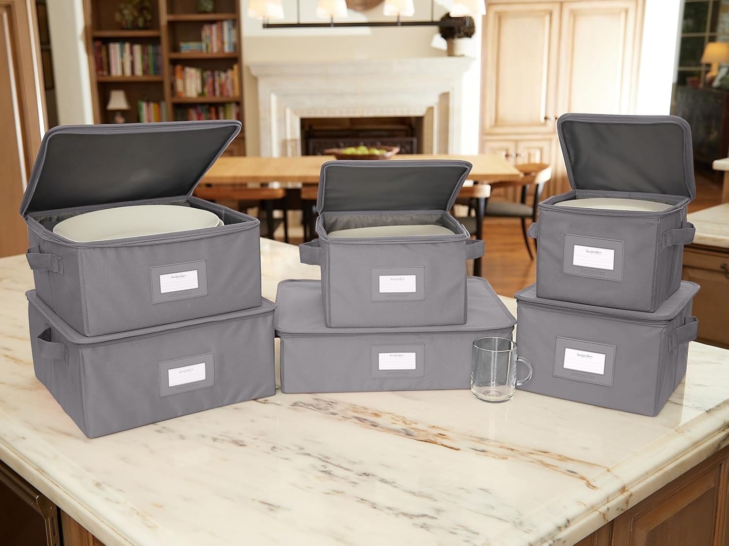 - STORAGE SIZE: 7 Piece Set - Includes 7 dish sizes: (1) 8W x 8D x 7H, (1) 10W x 10D x 7H, (1) 12W x 12D x 7H, (1) 14W x 14D x 7H, (1) china cup storage: 17W x 13D x 5H, (1) stemware storage: 15W x 12D x 10H, (1) flatware storage: 15W x 11D x 3H