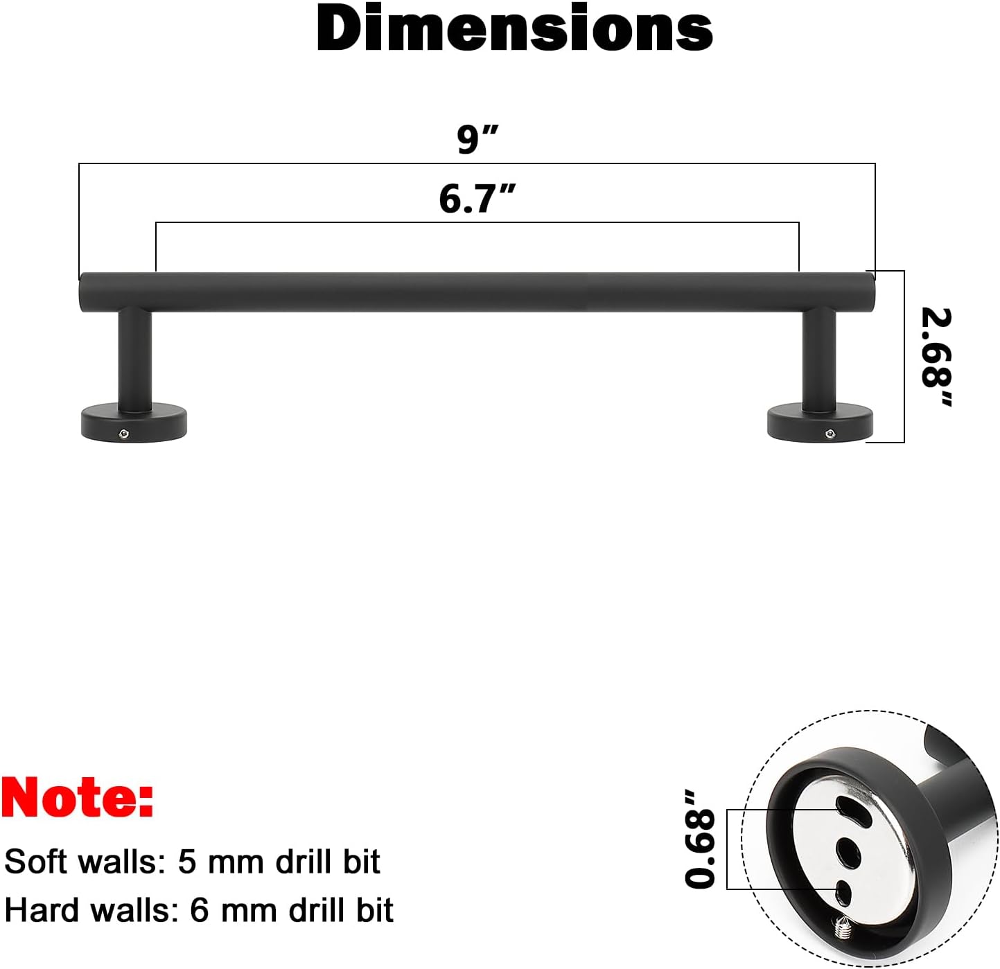 - DIMENSIONS & USE: Overall length is 9" (304mm). The length of hanging space is 7.5" (190mm). 22-Lbs (10kgs) max weight capacity. You can mount this towel bar to either side of your cabinet or closet door for storing at-use hand and dish towels. It can also be used with S hooks, hanging bath balls, hairdryers, teacups, spoons, clips, etc.