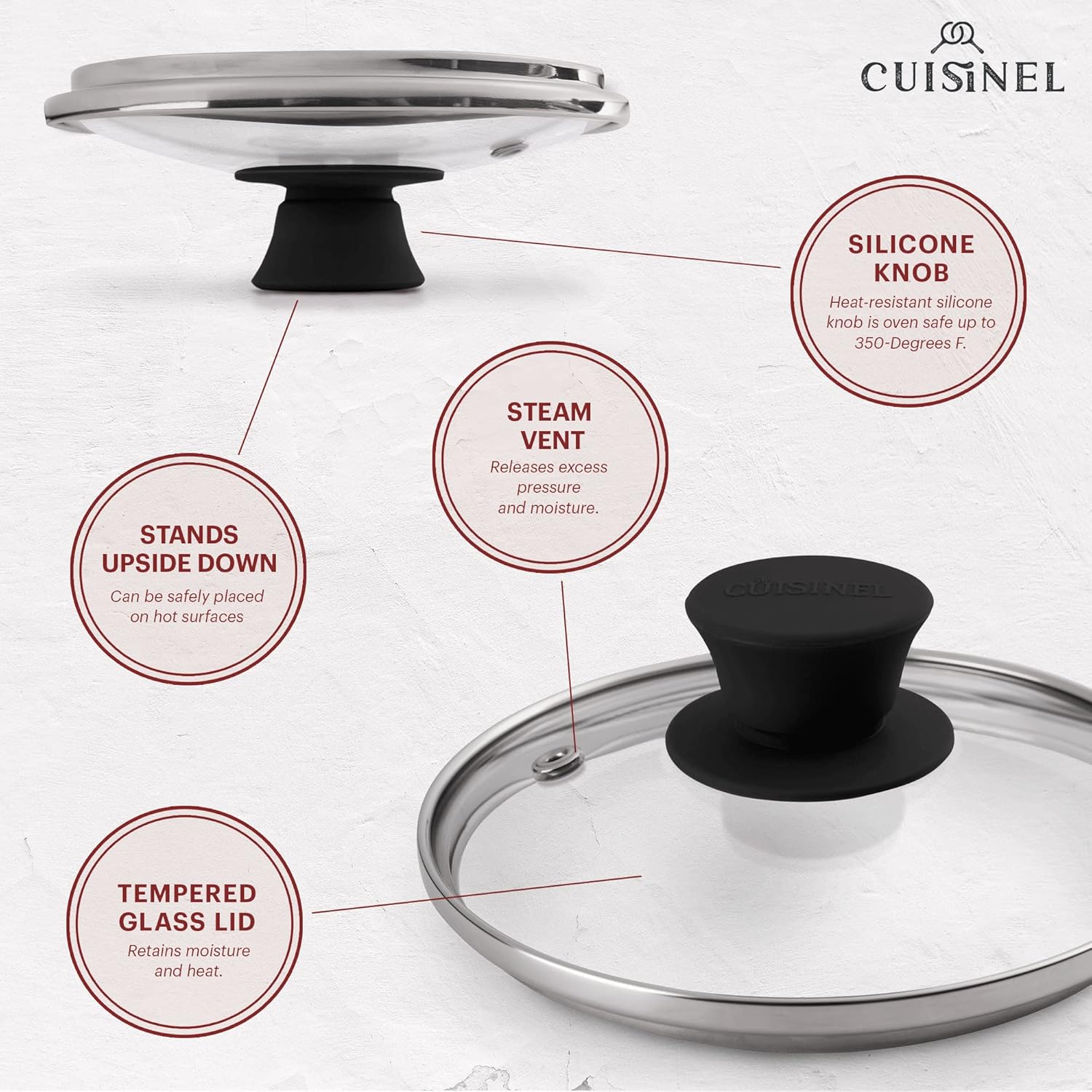 - STEAM VENT HOLE: Cuisinel's professional quality lids β now updated with steam vent holes to prevent liquid from boiling over. Vent holes allow just the right amount of moisture to evaporate easily so your food doesn't saturate in liquid. Vent holes make sure the glass lid doesnβt cloud up β allowing you to easily see cooking progress without removing lid.