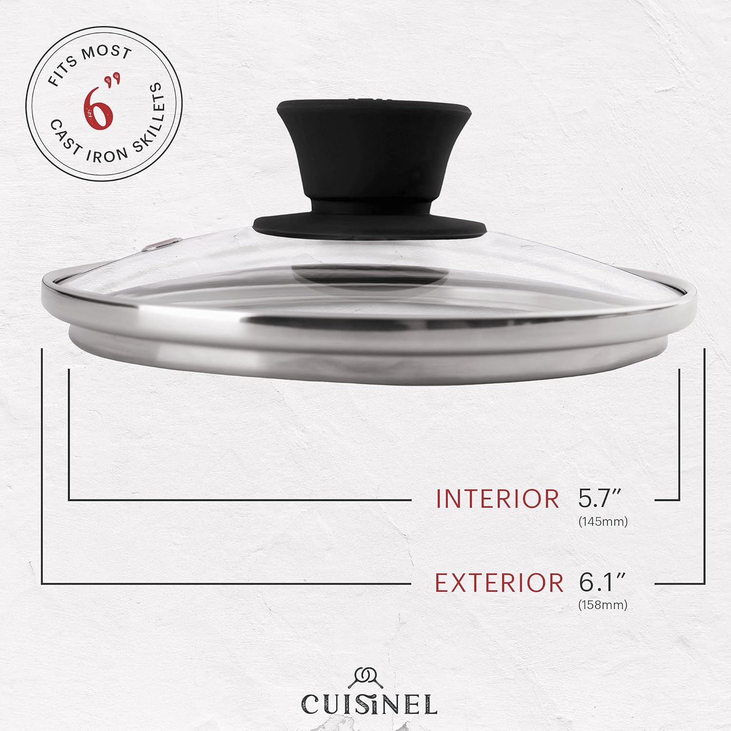 Glass Lid with Steam Vent Hole - 6"-Inch/15.24cm - Compatible with Lodge Cast Iron Skillet Pan - Fully Assembled Universal Replacement Cover - Tempered and Oven Safe - Reinforced Stainless Steel Rim
