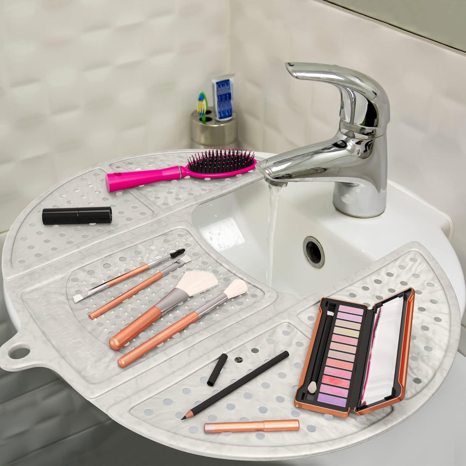 - DECLUTTER YOUR SPACE: Clear clutter with this silicone sink mat solution that supports up to 7 lbs—great as sink protectors for bathroom sink storage of beauty tools, brushes, and toiletries.