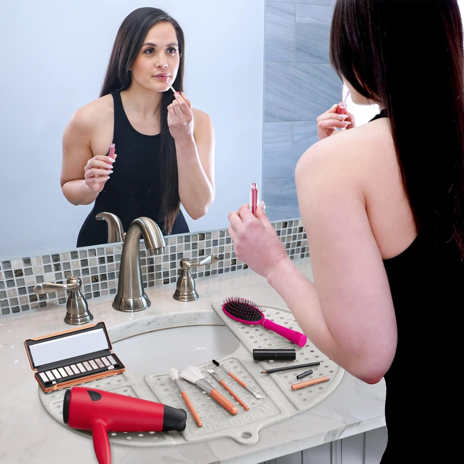 - DECLUTTER YOUR SPACE: Clear clutter with this silicone sink mat solution that supports up to 7 lbs—great as sink protectors for bathroom sink storage of beauty tools, brushes, and toiletries.